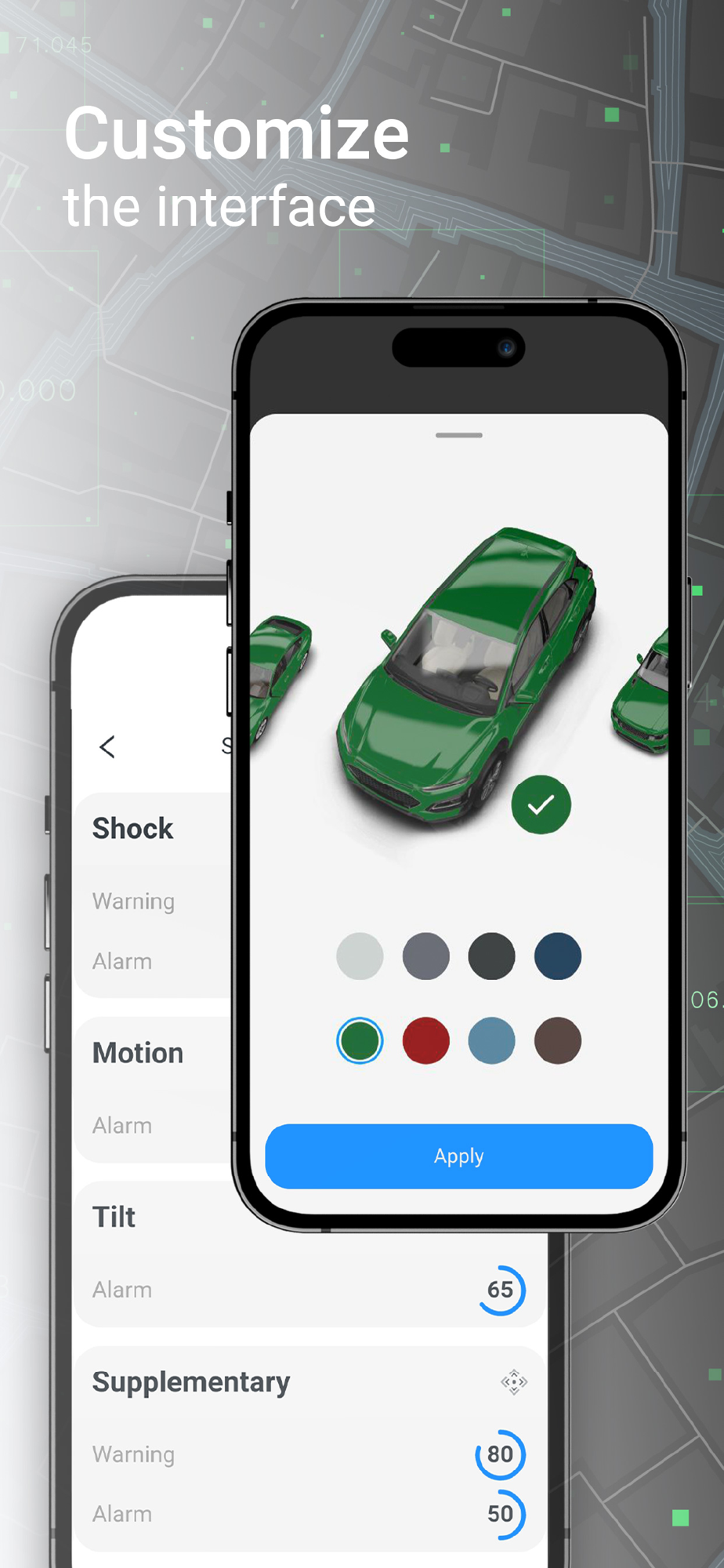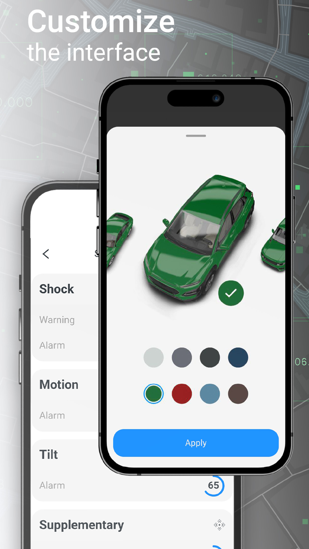 customization of the interface (different vehicle skins, colors, app themes and information blocks)