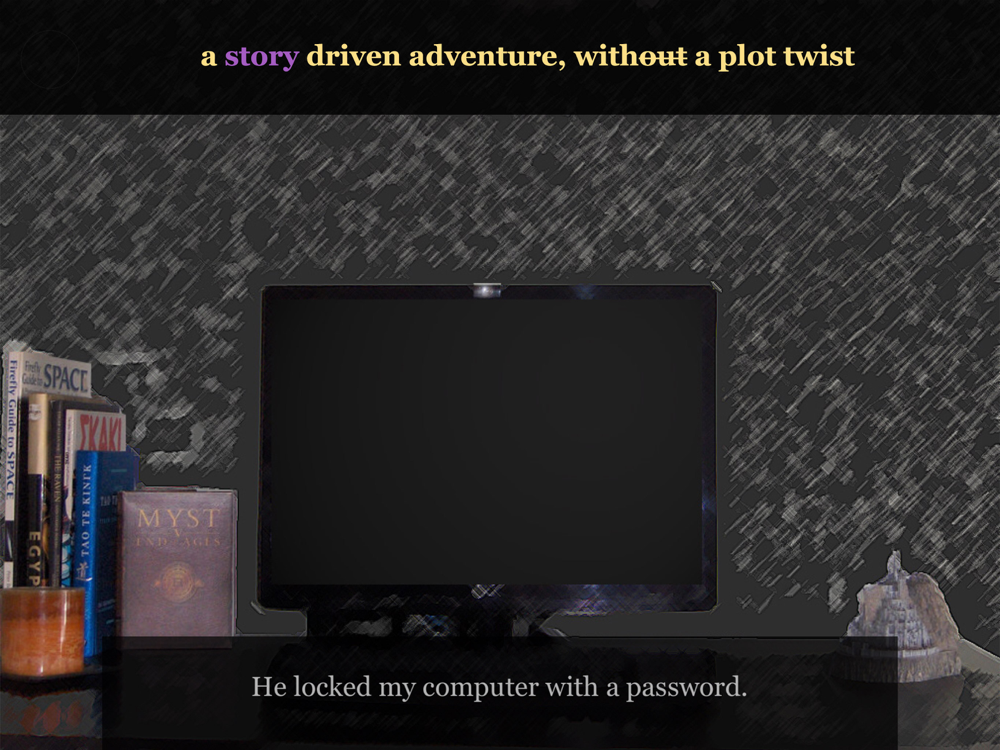 You wake up in the middle of the night and you find yourself in your room, but everything feels out of place. It seems like your brother locked your computer, messed with your stuff and left clues all around to help you decrypt the password. But why would he do that? And why does your room seems so weird?