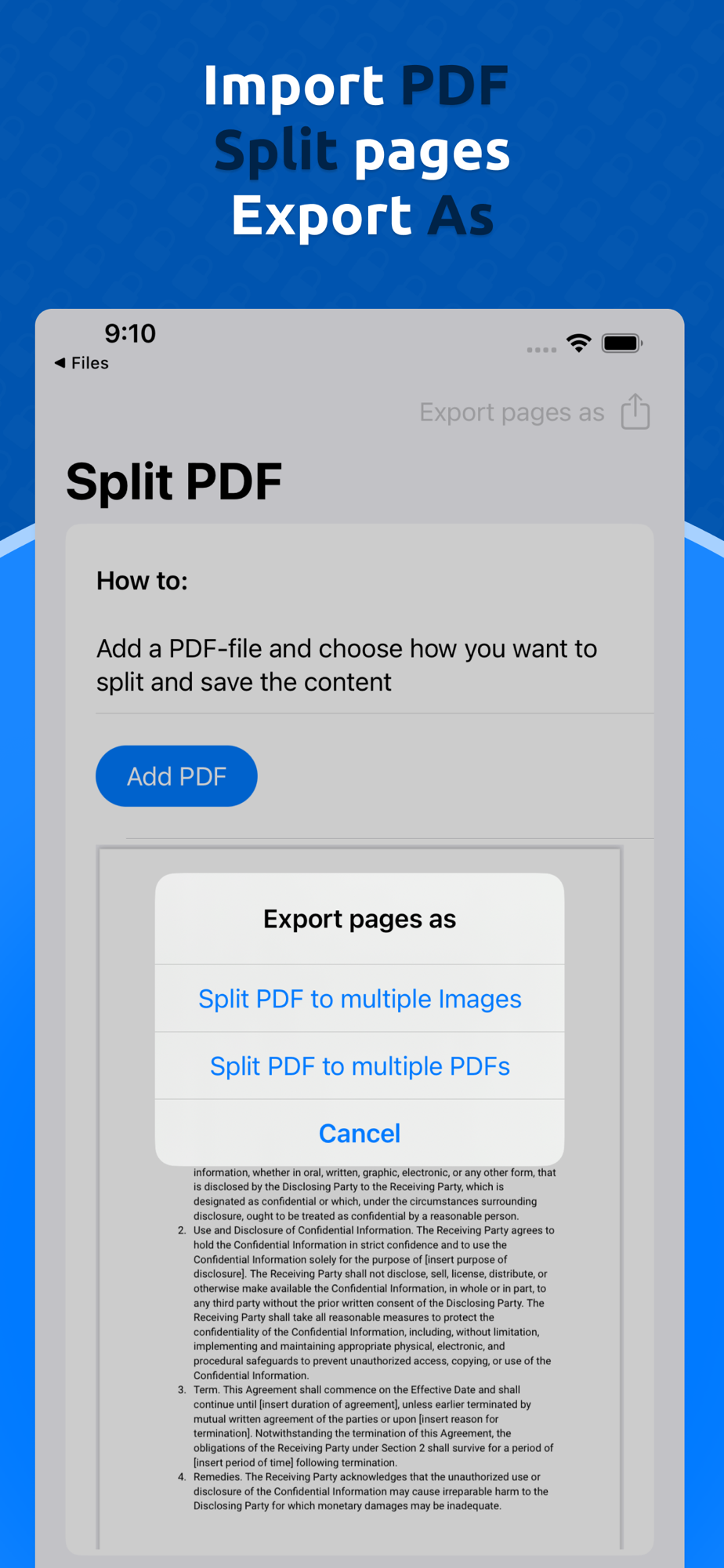 - Import PDF files and split into multiple PDF files or split PDF pages into multiple Images