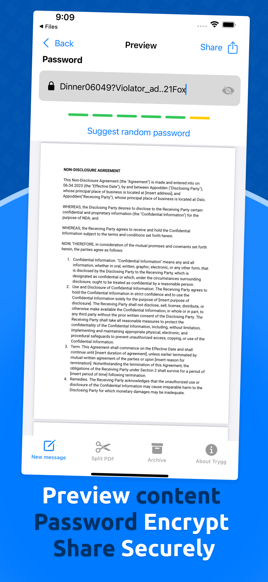 Trygg lets you easily photos, scan documents add text, signatures, images and PDF files to create password encrypted ZIP archive or PDF files and easily share them however you want. iMessage, E-mail, Messaging apps, Filesharing etc.