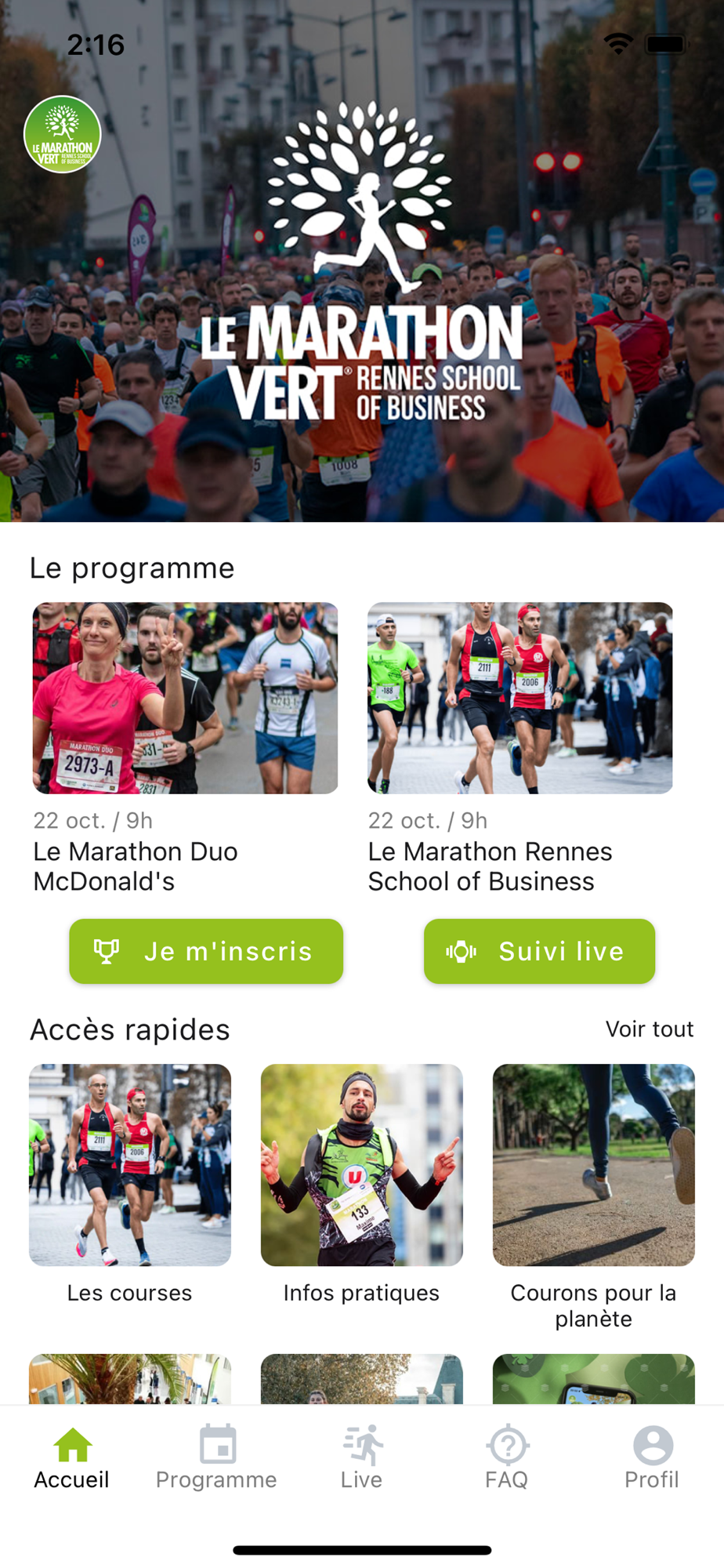 L’App Le Marathon Vert Rennes School of Business permet d’être au fait de toutes les actualités relatives à l’évènement, de consulter le Pass’sport de manière digitale et intuitive, et ainsi de préparer votre évènement. Vous serez notifiés de toutes informations indispensables pour réaliser votre Expérience Coureur.