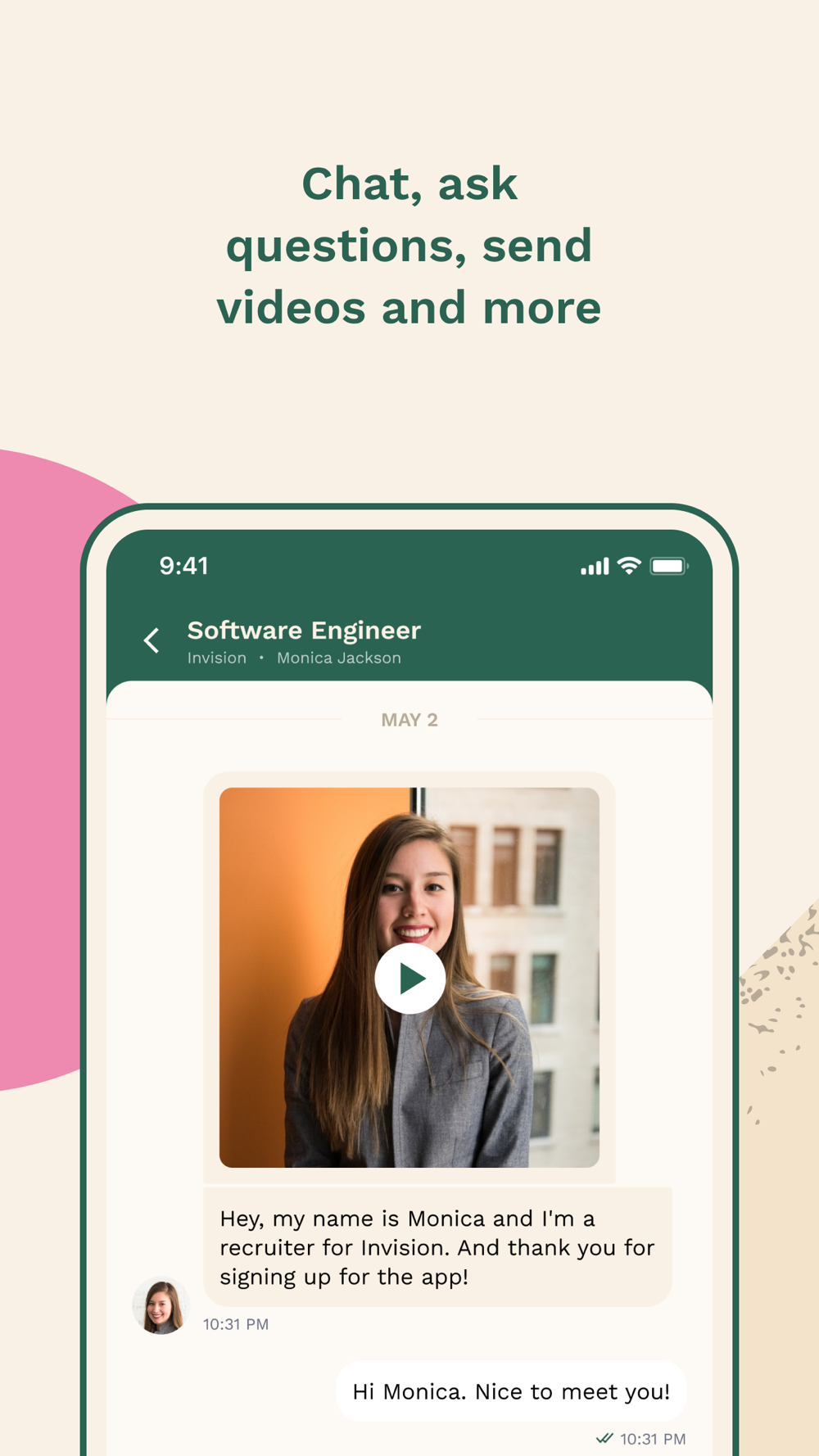 Create & share videos, images, resumes, portfolios – all through our conversational bridge. Eliminate steps & overhead in the recruiting process. Spend more time on growing your relationship with your prospective teammates!