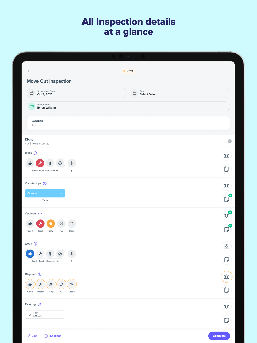 Happy Property: Maintenance comes complete with fully customizable forms that adapt to your business requirements as well as your property and unit layouts. For real-time property operations that speed turns, improve life safety, curb appeal, and preventative maintenance, as well as help you conduct faster, more accurate walks during property acquisition, Inspections in Happy Property: Maintenance has you covered.