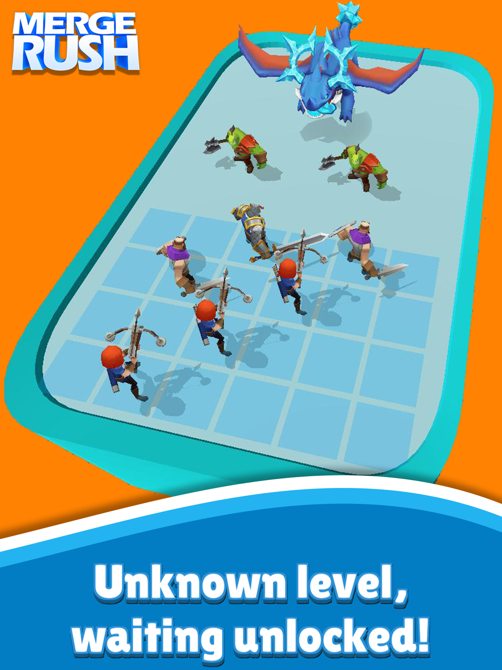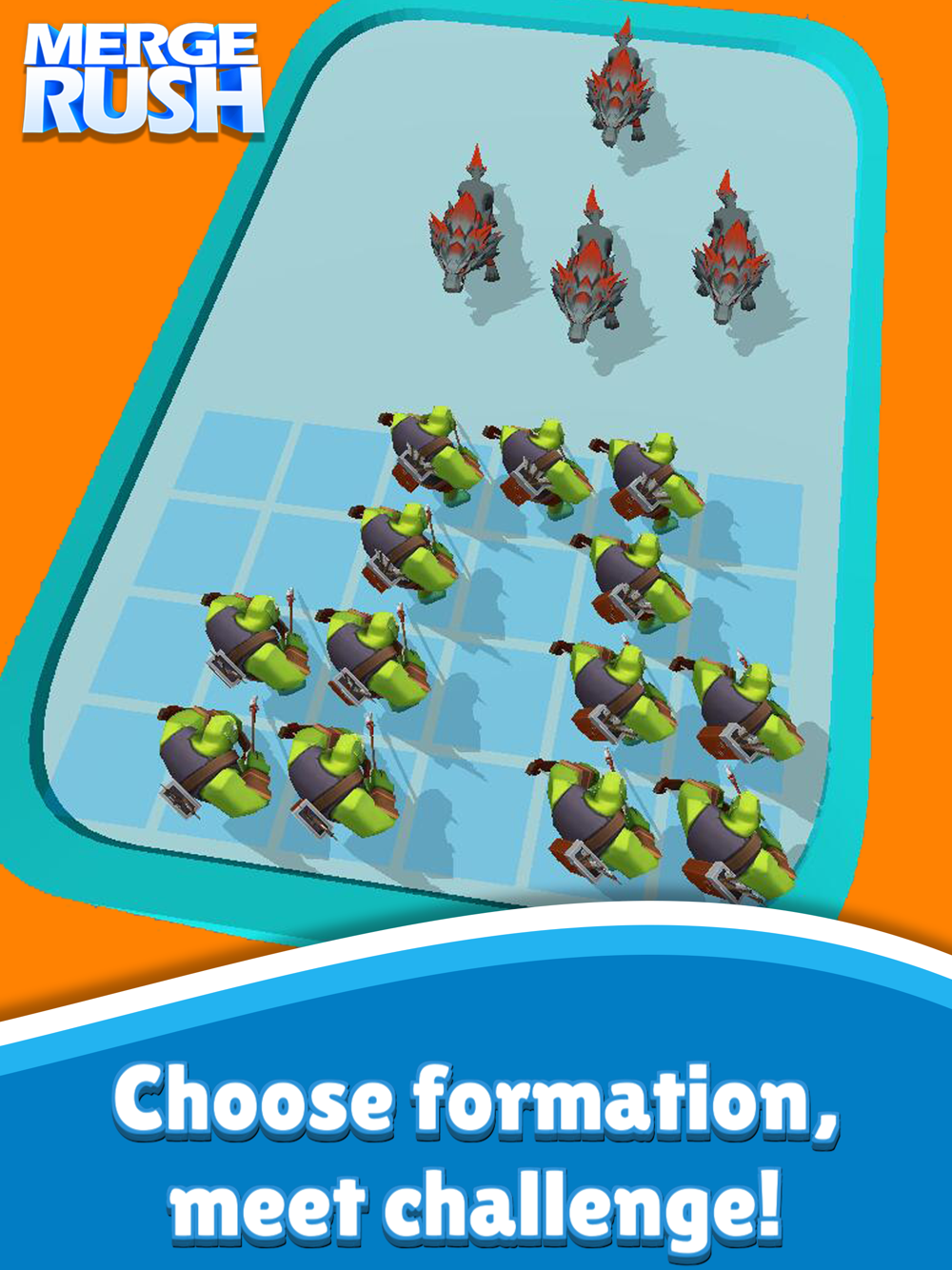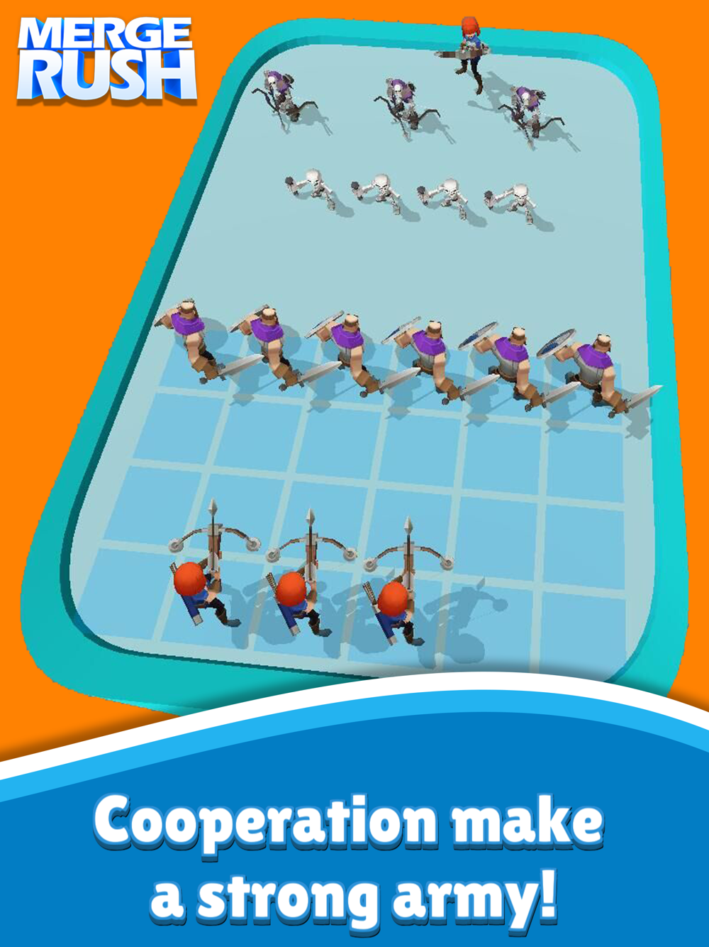 Merge Rush is a fun game with merge game play. Merge fighters of lower level to get higher level and become stronger to win the battles.