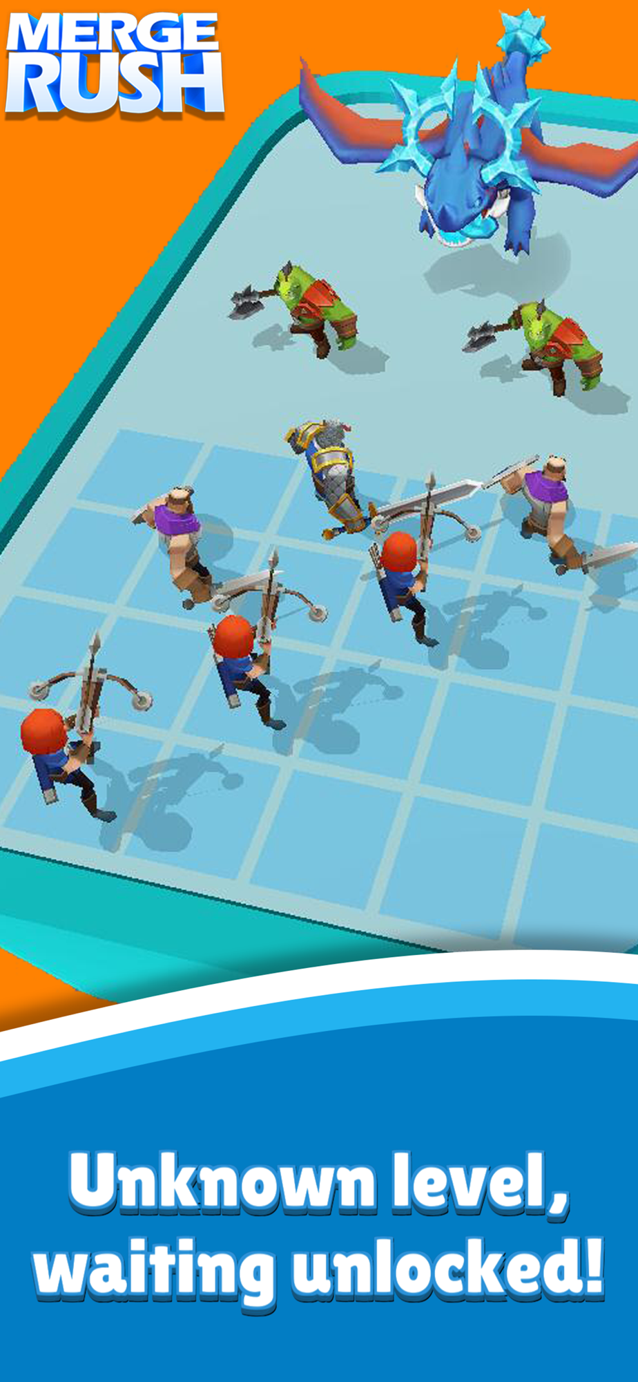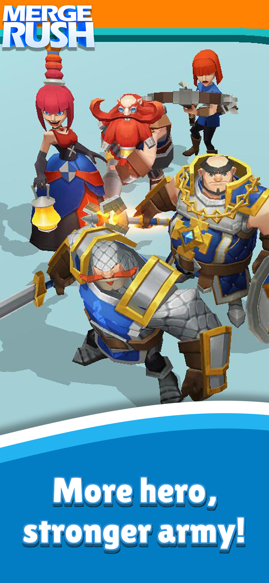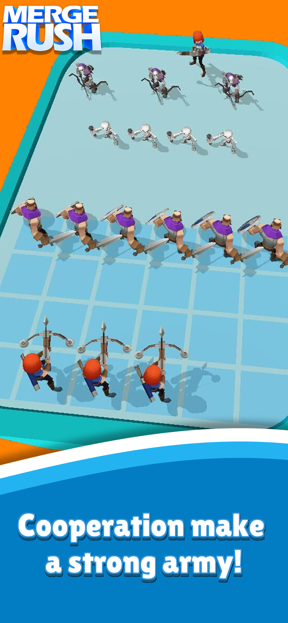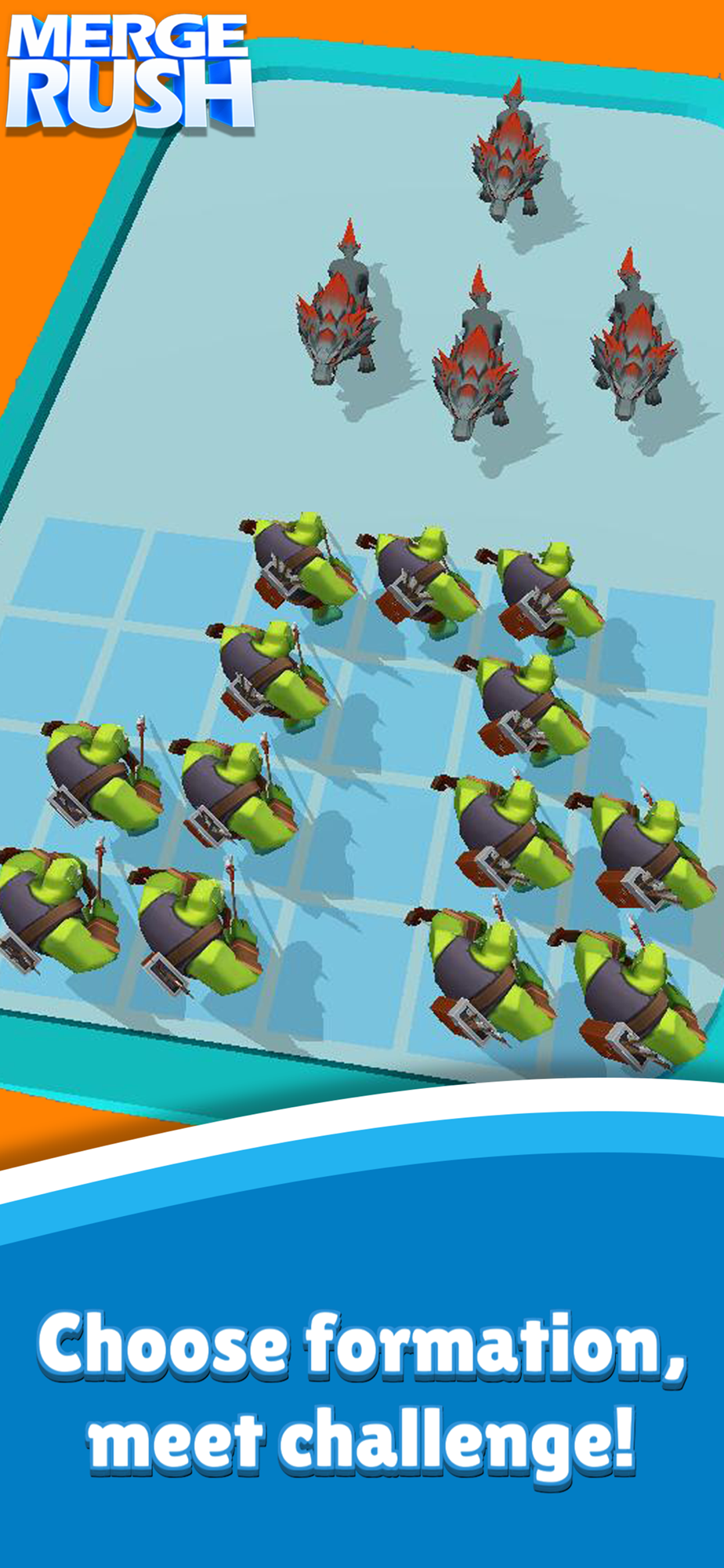 Merge Rush is a fun game with merge game play. Merge fighters of lower level to get higher level and become stronger to win the battles.