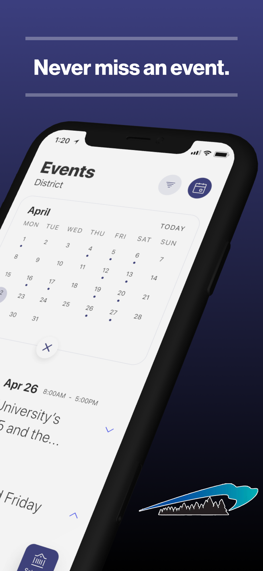 The event section shows a list of events throughout the district. Users can add an event to their calendar to share the event with friends and family with one tap.