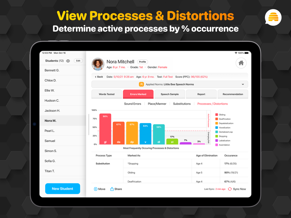 Displays all the phonological processes and distortions marked in the test. It does this with a visual graph as well as a list of processes marked.