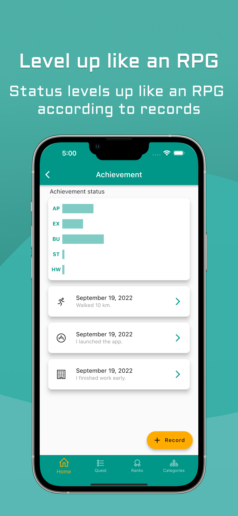 HibaQuest is a gamification application that "turns everyday life into a game" including records, memos, habits, and ToDos. You can feel your daily growth as your status levels up according to your input, just like in an RPG.