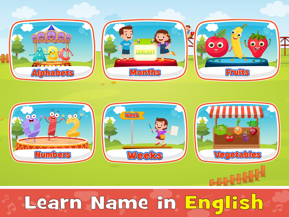 Learning English through games is one of the best ways to teach your child to speak English on his own. In this English Club game, your child can learn the English alphabet, numbers, English month, weekdays, vegetable and fruit names, food dishes and dry fruit names, vehicle, birds, and animal names, colours and shapes, job & occupation, name of computer parts, school stationery, seasons of the year, and direction names in English