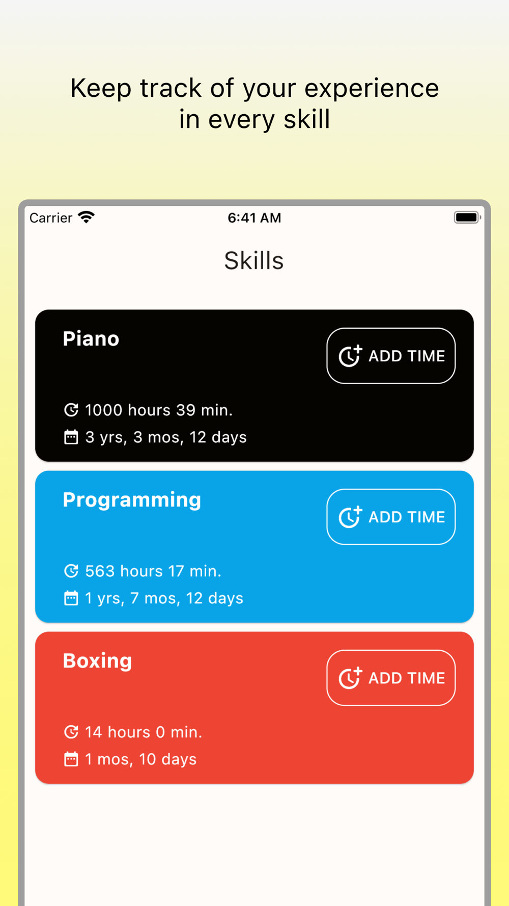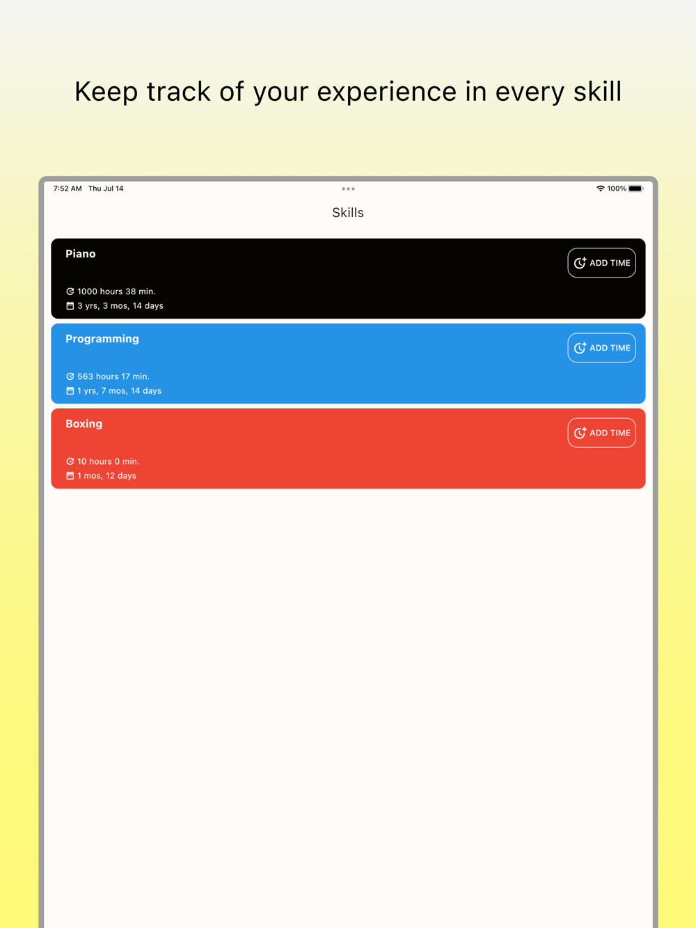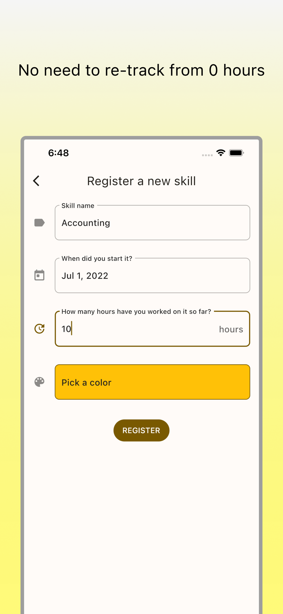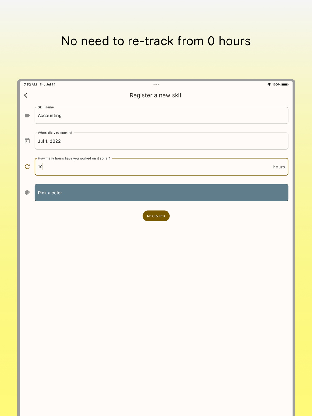 - Register the time you have spent so far when you add a skill. No need to count up from 0 minutes.
