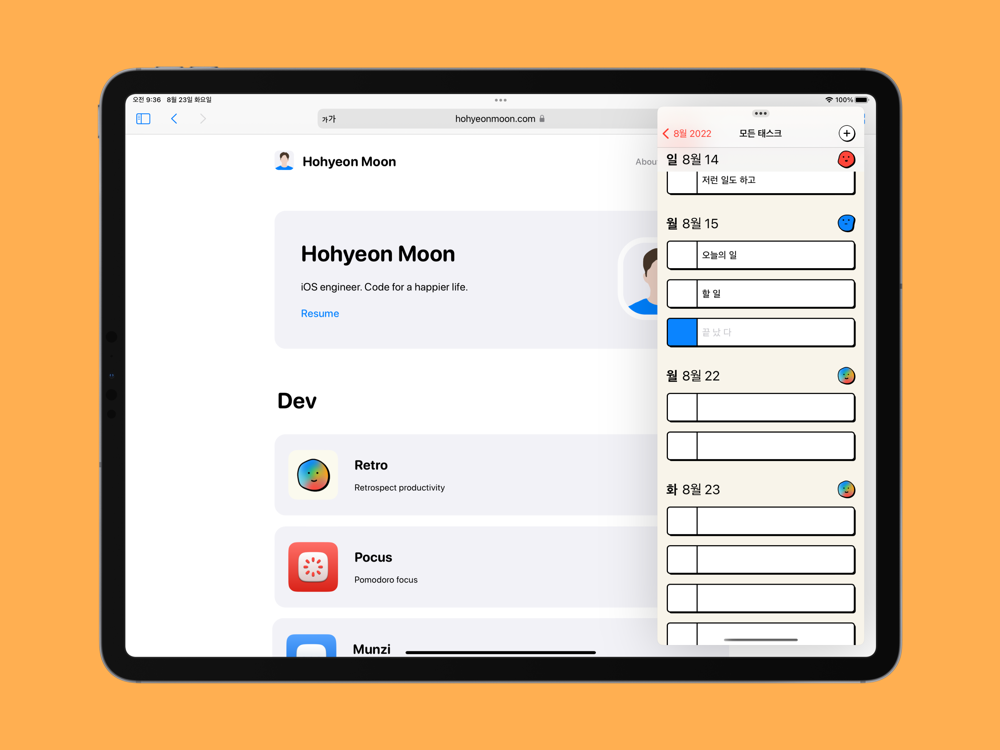 앱 이름인 Retro는 레트로(retro) 느낌을 살린 생산성을 회고(retrospect)하는 앱이라는 의미에서 중의적으로 지어졌습니다. 앱이 만족스럽다면 앱스토어 리뷰에 피드백을 남겨주세요. 긍정적인 리뷰는 서비스 운영에 큰 힘이 됩니다!