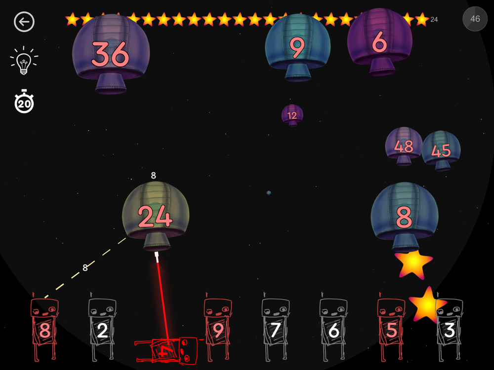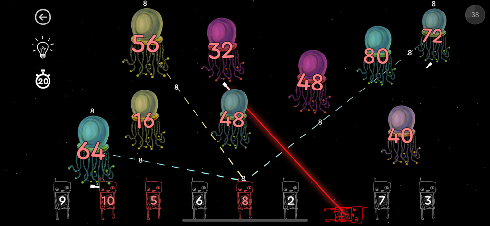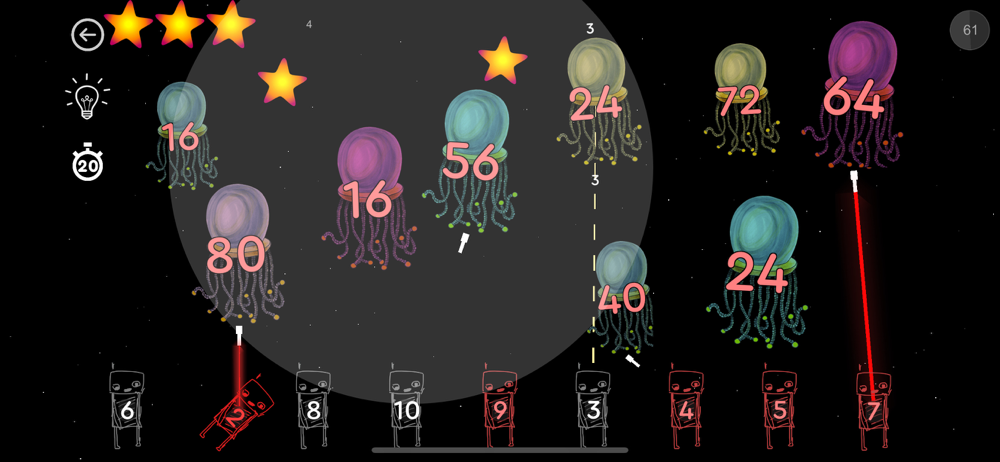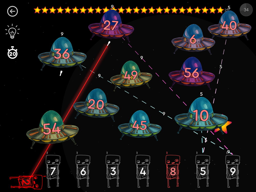 2. Game mechanics. The alien spaceship must be hit by the robots you control. To do this, guide the rays from the robots to the alien spaceships. If the multiplication result matches, the spaceship will be destroyed.