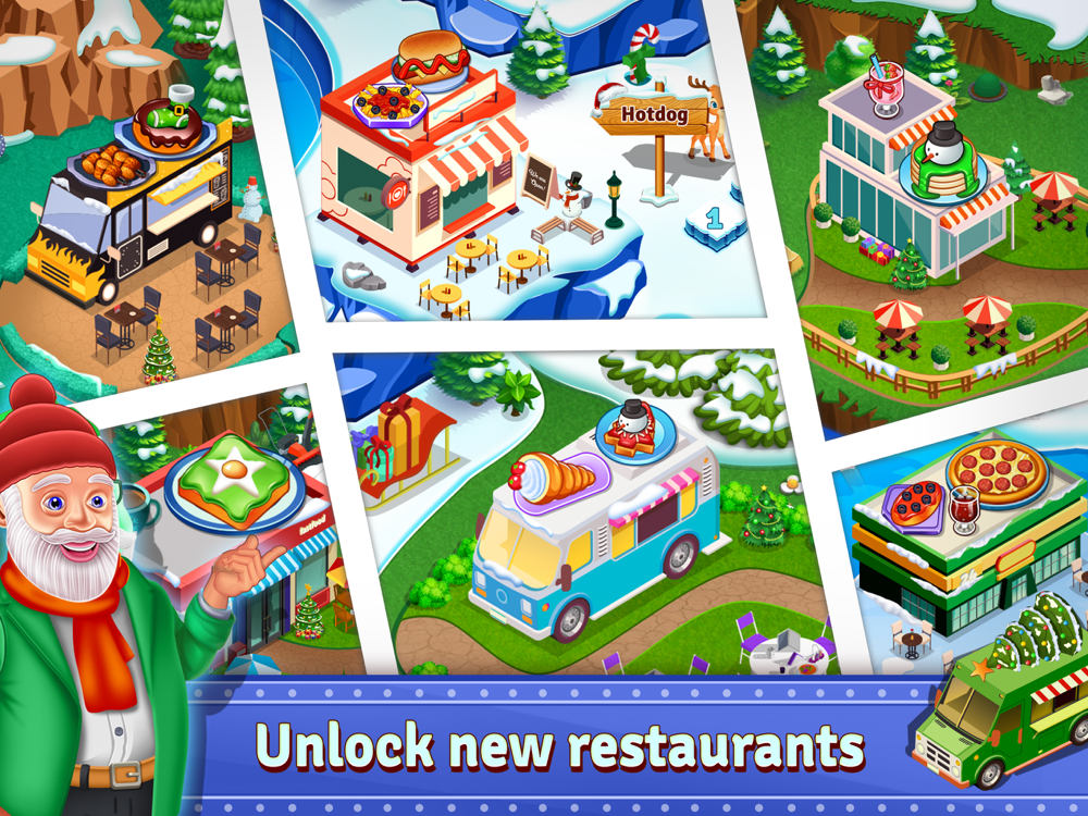 Levels in the game are designed to make you forget the world and enjoy the Christmas cooking experience. Head from one restaurant to another on this journey. You will unlock new restaurants as you go and explore the Christmas valley.