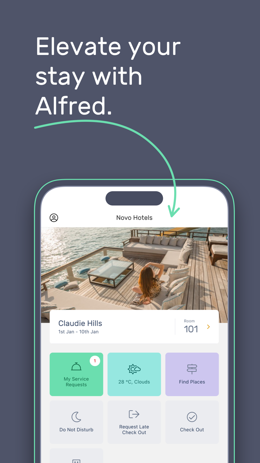 We want to make your stay as enjoyable and convenient as possible. With Alfred App, you can easily view you booking information, request room service, chat with front desk, and much more.