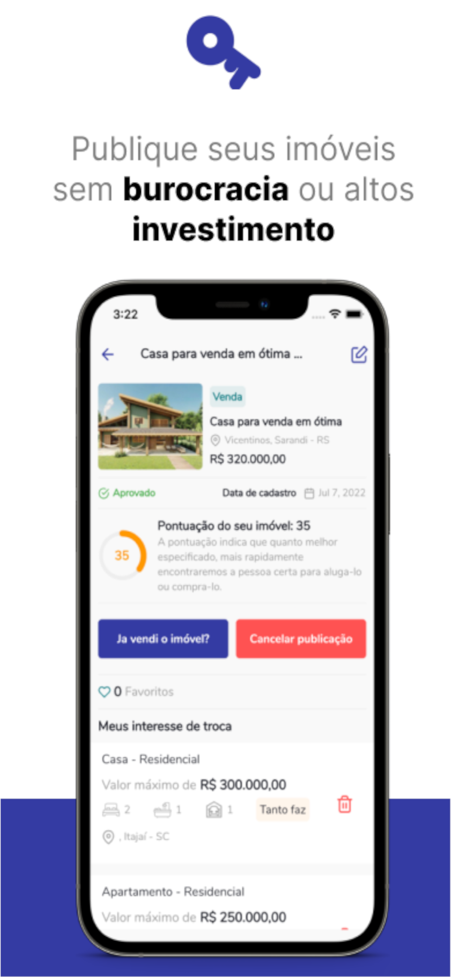 E para quem busca vender imóvel temos a possibilidade de registrar os interesses de permutas, em outras palavras, você cadastra seu imóvel e informa as possibilidades de permuta e quando encontrarmos algo para você o aplicativo irá alertar.