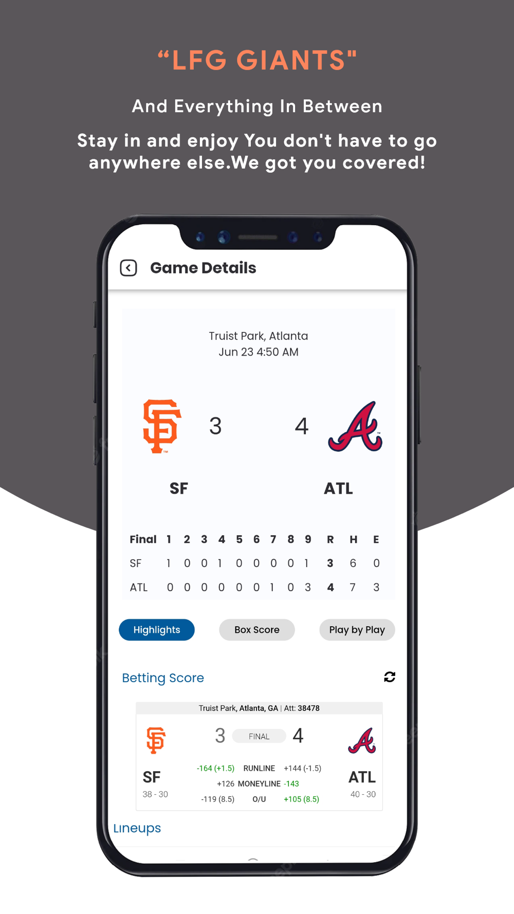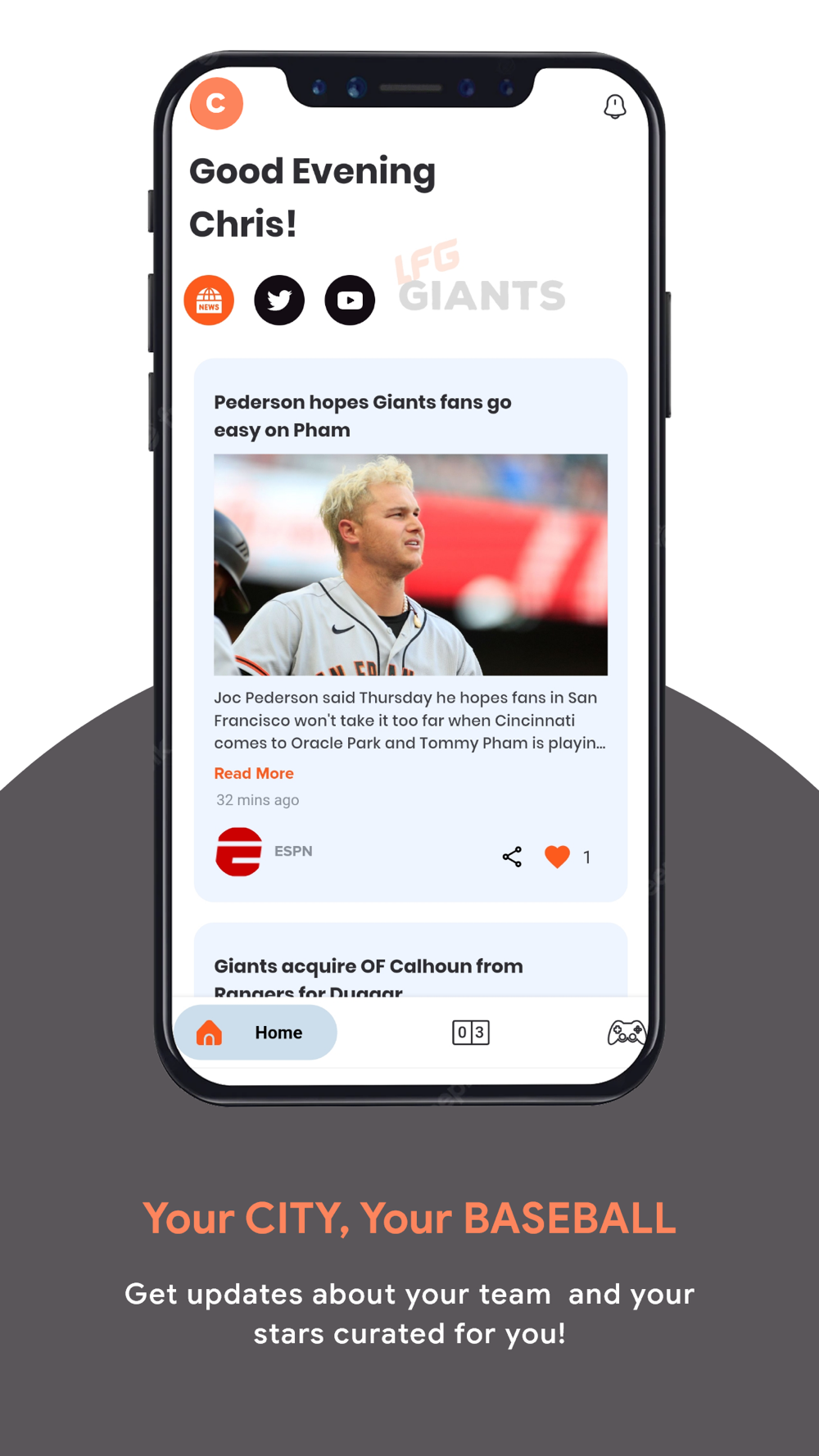 Your LFG Giants one stop app! Earn loyalty rewards! Get all Giants news and scores from across the web in one easy place with personalized streams that send alerts as soon as stories break. Enjoy every LFG Giants game with the best online play by play you’ll find along with: - Game Results - Schedule - News - Injury Reports - Player and Manager Interviews - Exclusive App Only Content, Trivia and Call your shot games, Loyalty rewards and more.