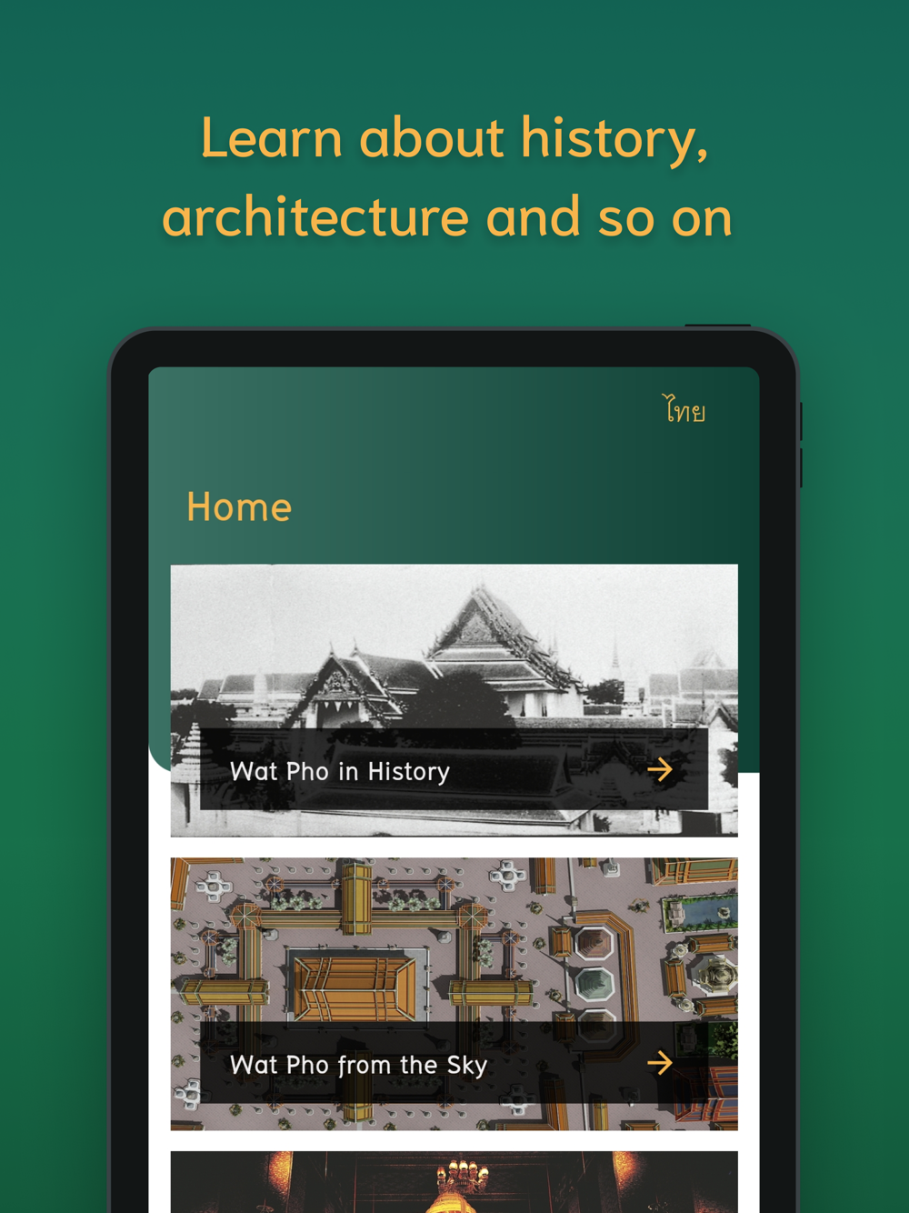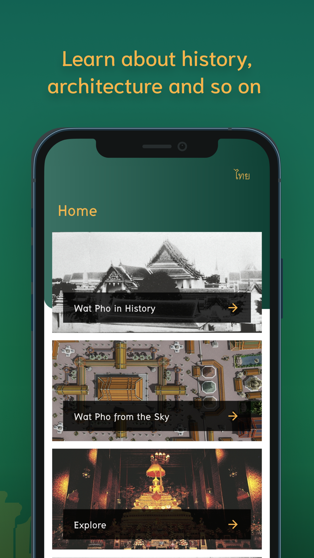 Enjoy exploring Wat Pho with the “Insight Wat Pho” app that turns your mobile phone into your travel buddy guiding you around the entire area of Wat Pho. Learn about the history, architecture, arts and crafts, and beliefs in Buddhism and Thai culture through audio narration, descriptions, pictures, and augmented reality (AR) technology. See the plan of Wat Pho in a different view never seen before. Reminisce about the place through vintage photos. Catch “Yak Wat Pho.” Solve the riddle poems inscribed on the Epigraphic Archives of Wat Pho which UNESCO registered as the Memory of the World. Available on smartphones and tablets. Suitable for tourists, students, and the general public. Supported by Wat Pho, Chulalongkorn University, and the National Innovation Agency (Public Organization).