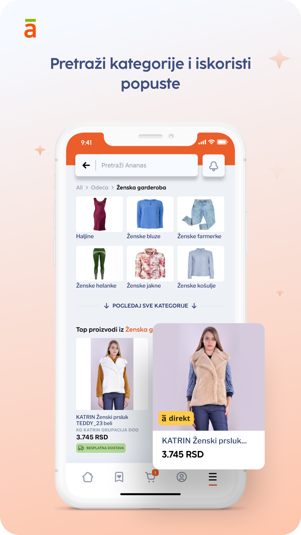 Ananas e-commerce is an online shopping mall. With the Ananas application, you can always choose and there, at any time of the day or night, you can expect a large offer of a wide variety of products classified into more than 20 categories. With an attractive offer, you can always save through regular promotions and big discounts. Payment is safe and easy, with cards on the app or cash on delivery.