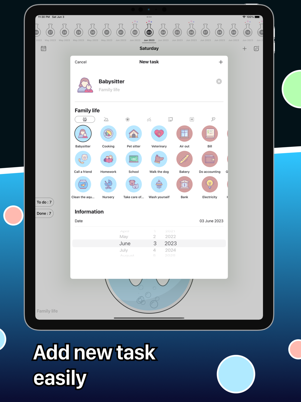 • Easy Task Addition: Simplify adding new tasks with a selection of predefined tasks. Choose from lovely icons to personalize your tasks and make the experience even more enjoyable.
