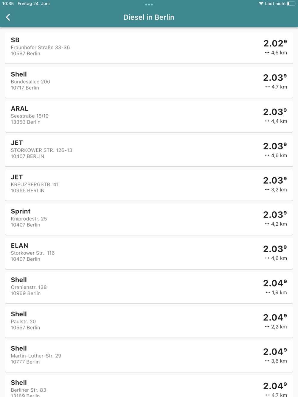 Dann erhälst du eine Übersicht mit den Tankstellen in dem gewählten Ort. Diese sind nach den Spritpreisen sortiert: Günstige Tankstellen sind oben, teure Tankstellen unten. Falls du an einer Tankstelle den Sprit nicht bekommen solltest, da diese beispielsweise geschlossen hat, wird diese unter den Ergebnissen unten am Ende ohne Preisangabe dargestellt.