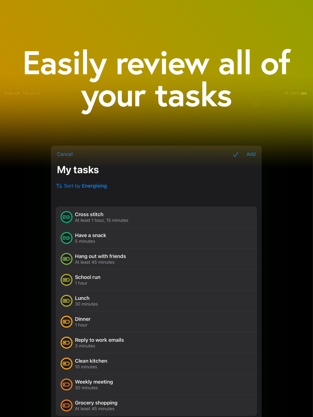 Dayzen is a different kind of day planner. Tell it about the jobs you need to get done, and the things you do for fun, and every day it will build a schedule that keeps your day in balance: as energising as possible, with the draining tasks at a pace you can handle.