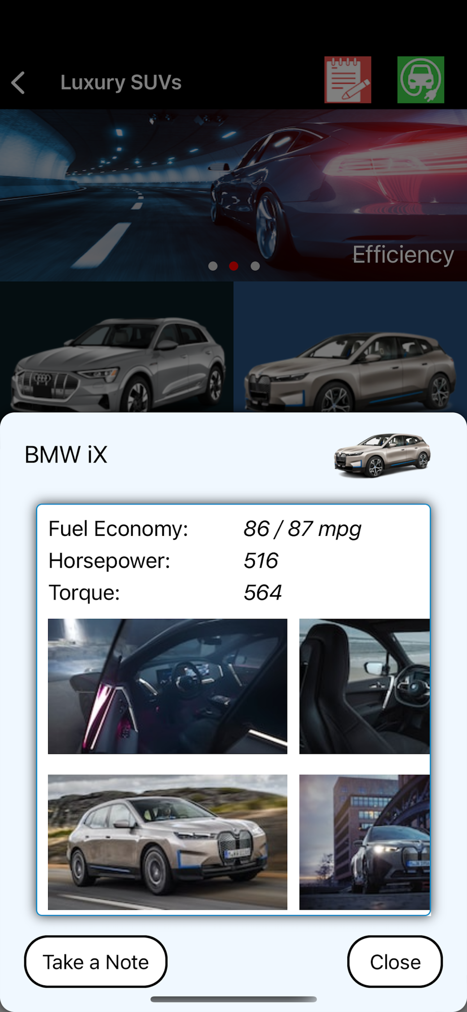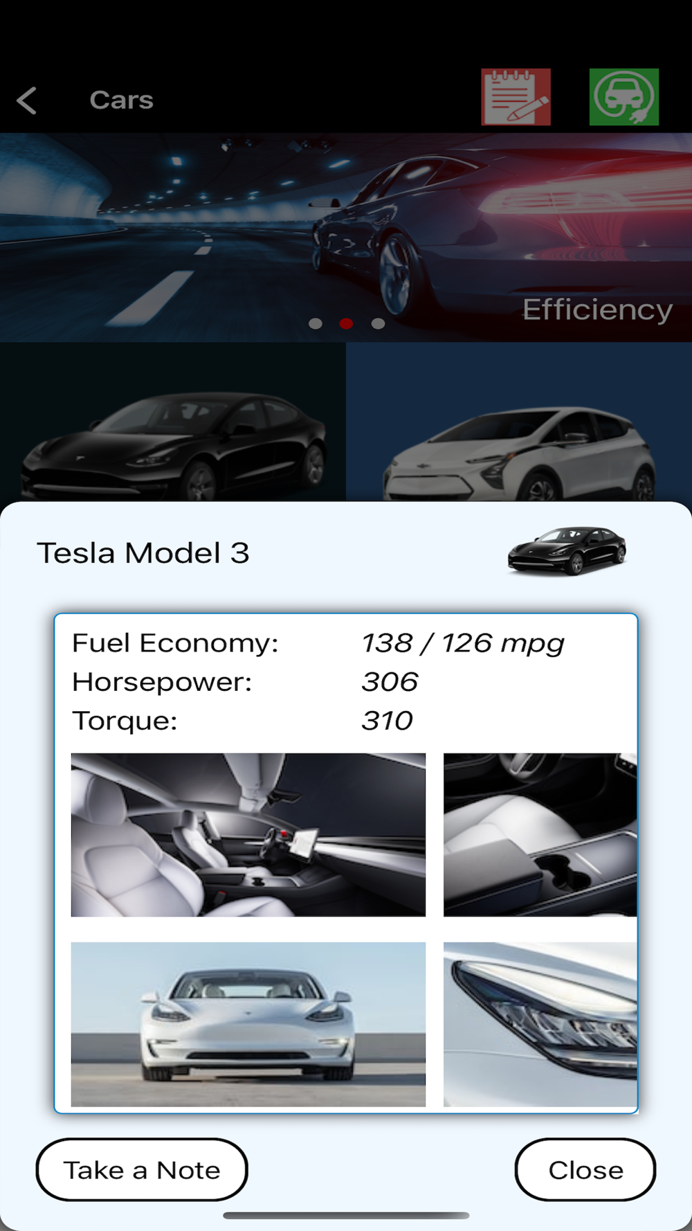 Jot down, save quick notes of EV models - view snapshots of interiors and exteriors;