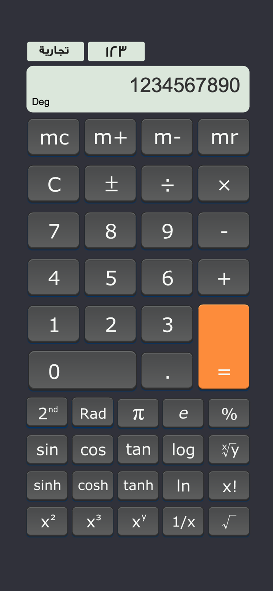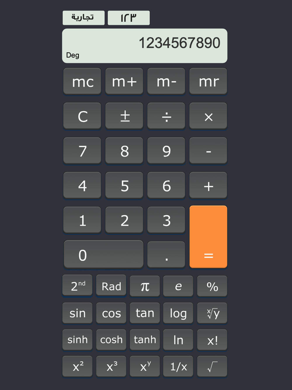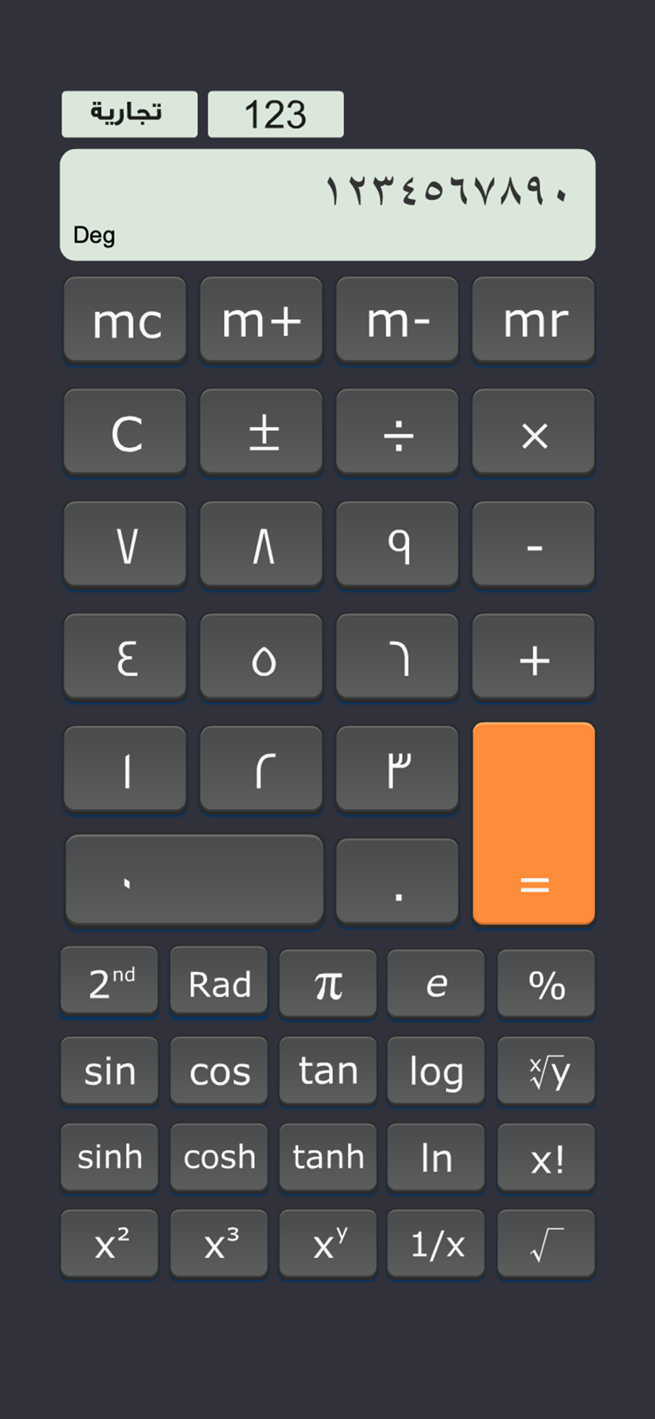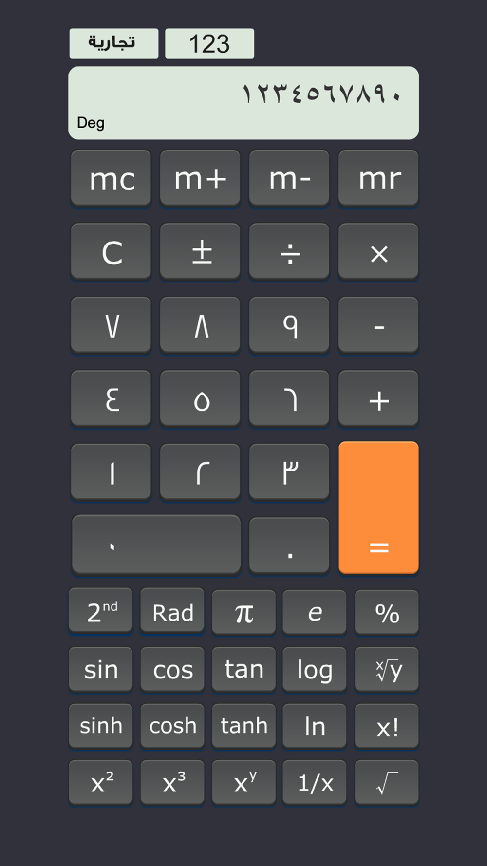 الة الحساب تطبيق يسمح للمستعمل من القيام بالعمليات الحسابية البسيطة و المعقدة باستعمال خيارات مثل الة حاسبة علمية او الة حاسبة تجارية باستعمال الارقام العربية او الارقام الهندية من دون فقدان النتيجة