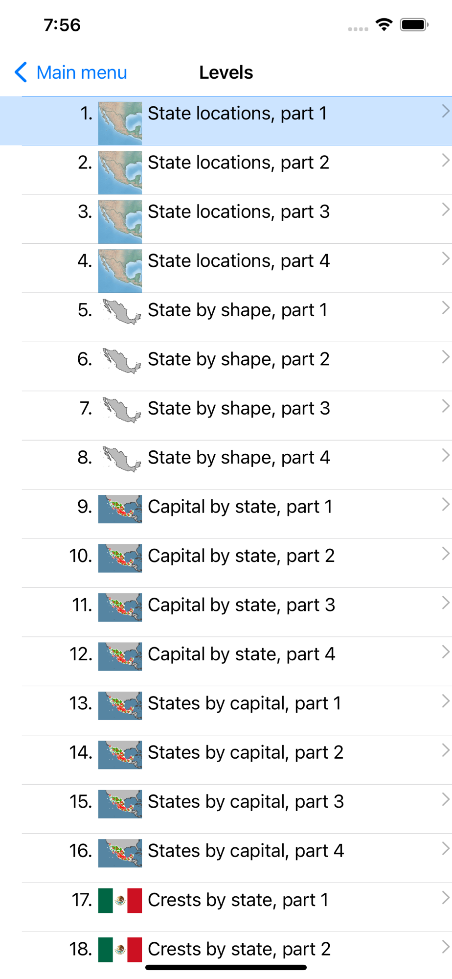 Play it as a game, where each level teaches you a new topic. Missed questions will be repeated until you learn the item and you can review them later. Pronunciation samples for states and capitals are included. We're trying to make learning easy!