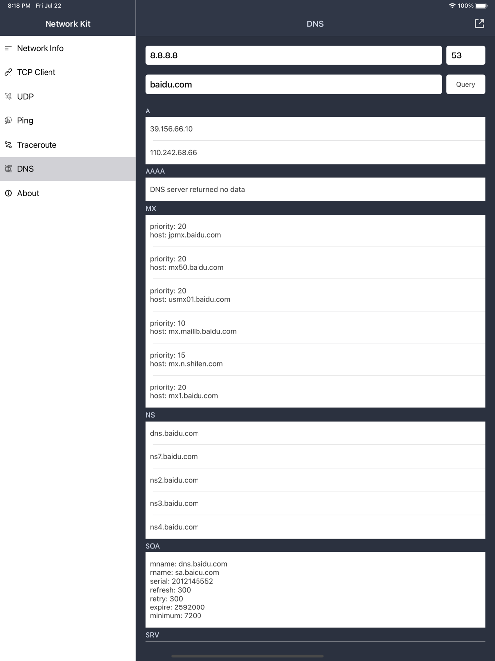 - Support TCP, TCP6, UDP, UD6, Ping, Ping6, Traceroute, Traceroute6, DNS query
