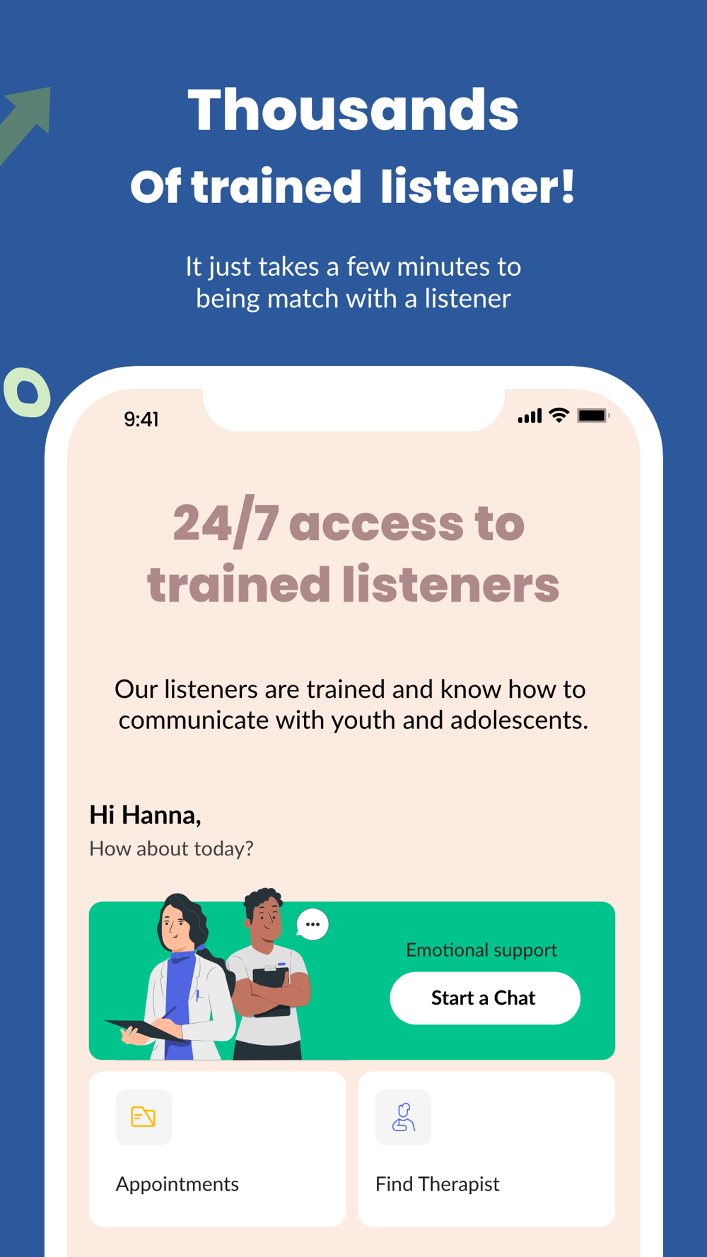 As soon as you are matched with a listener, you will be able to chat instantly. Each time, you can choose a new listener, or you can choose one and develop a lasting relationship with him or her.
