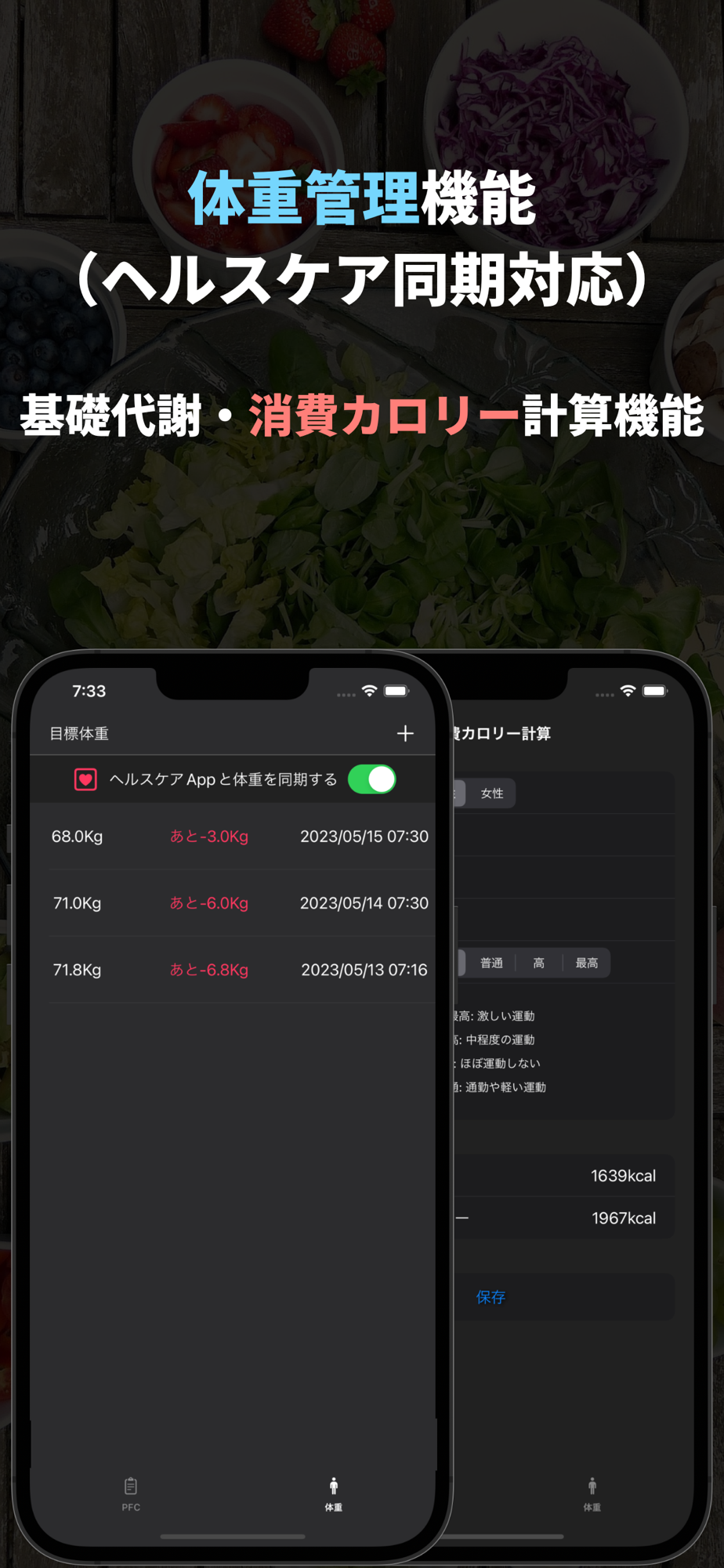 ダイエットに不可欠なカロリー支出・PFCバランスを手軽にチェックできます。