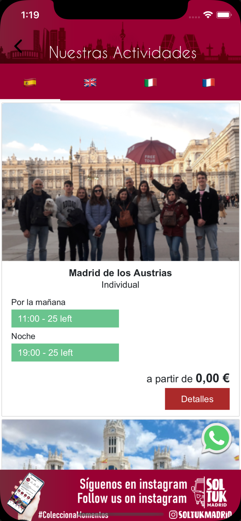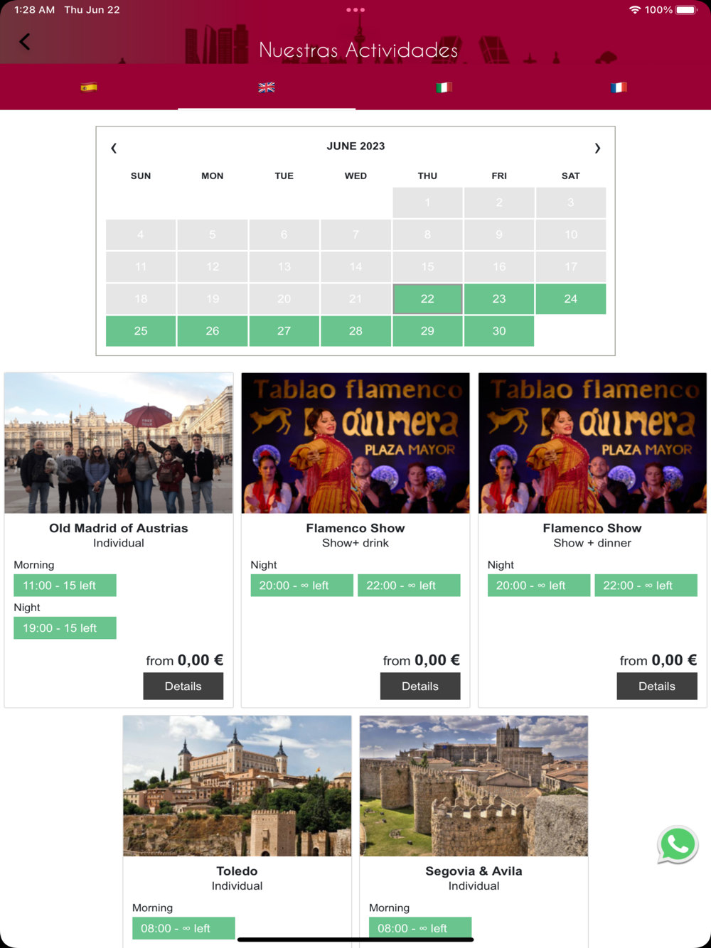 Con nuestra app es muy fácil reservar tu cupo para asistir a cualquiera de nuestros recorridos y experiencias: walking tours por el centro histórico y moderno de Madrid, divertidos paseos en tuk tuk, visitas guiadas a museos, show flamenco, paseos a Toledo, Ávila, Segovia, etc, paseos en segway, bus turístico, pubcrawl y más.