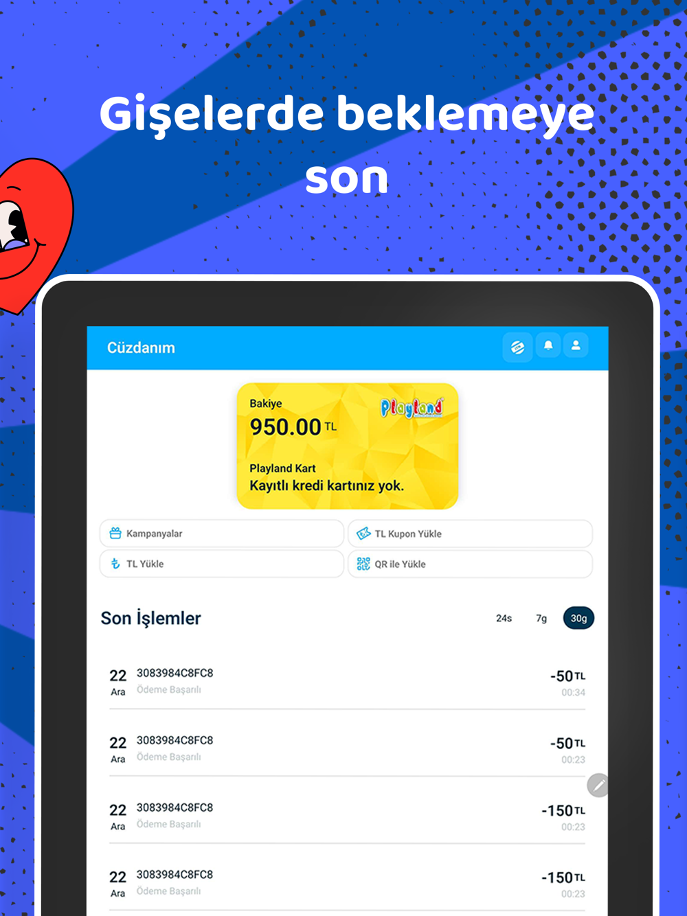 Oyun alanlarında çocuklarınızın hareketlerini mobil uygulama üzerinde denetleme ve kısıtlanabilir çocuk profilleri ile çocukların gelişimine zararlı olabilecek oyunları oynamalarının önüne geçin. QR kod ile hızla ödeme yapın ve çok daha fazla ayrıcalığa Playland uygulaması ile sahip olun.