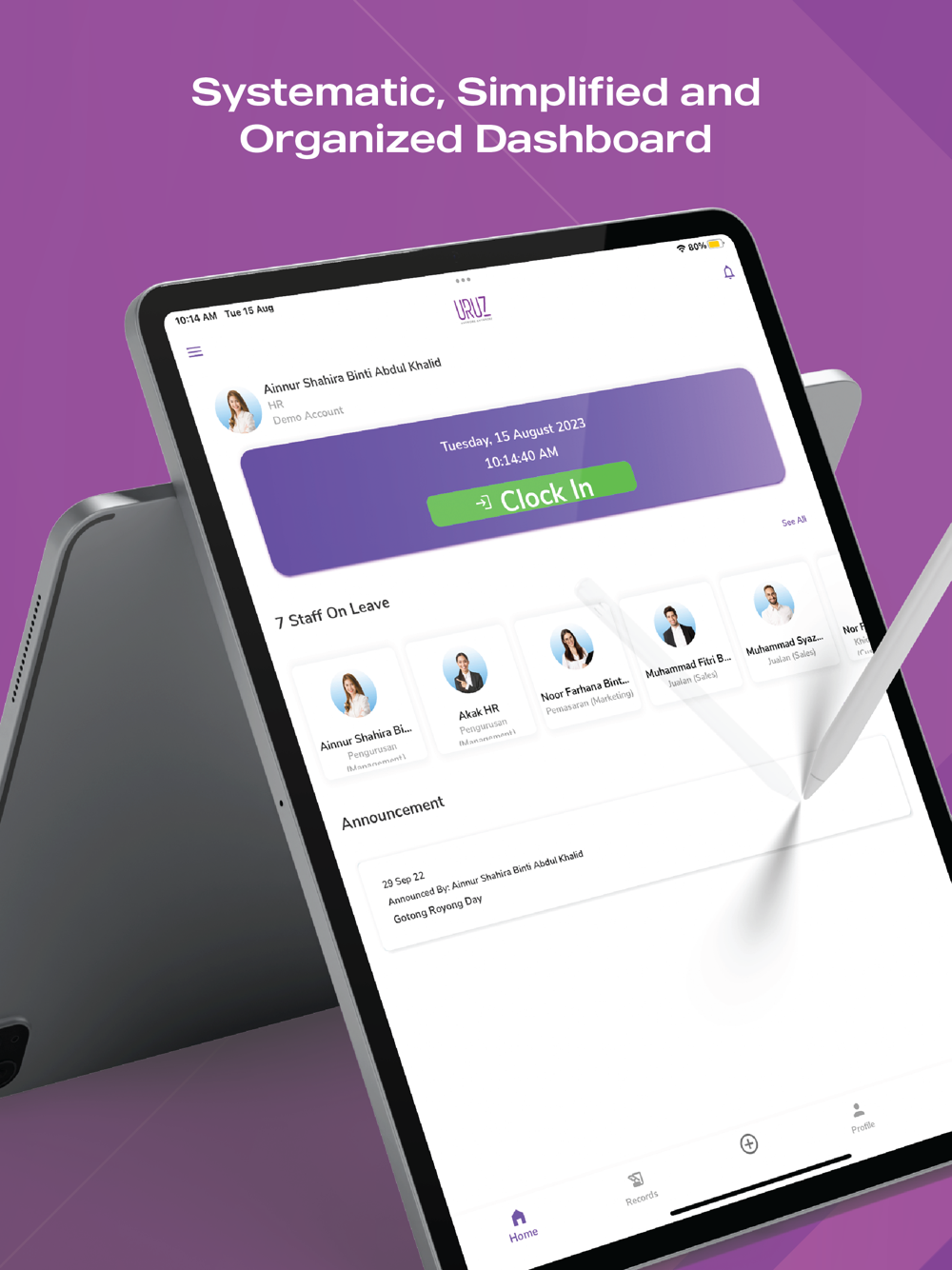 URUZ is a system that focuses on the quality of management systematically from HR related matters to creating a quality company management ecosystem so that management can measure the quality & performance of staff. Daily Work Report, Drop & Send File Easily, Integration With Quotation System, Easier Payroll, Efficient Outing System, Staff Leave Display, Announcements & Calendar, OT, Claims & Leave.