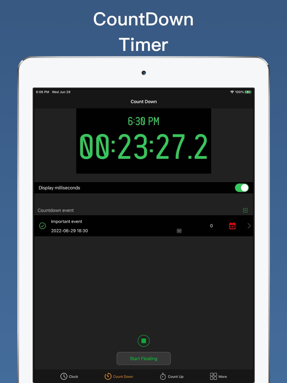The Floating timer can be suspended on the main screen of the device and displayed on top of other apps. Provides a clock display accurate to milliseconds, and a small countdown window.