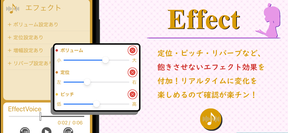 音量、定位、ピッチ、増幅、歪み、リバーブなど幅広いエフェクト付加が可能です。
