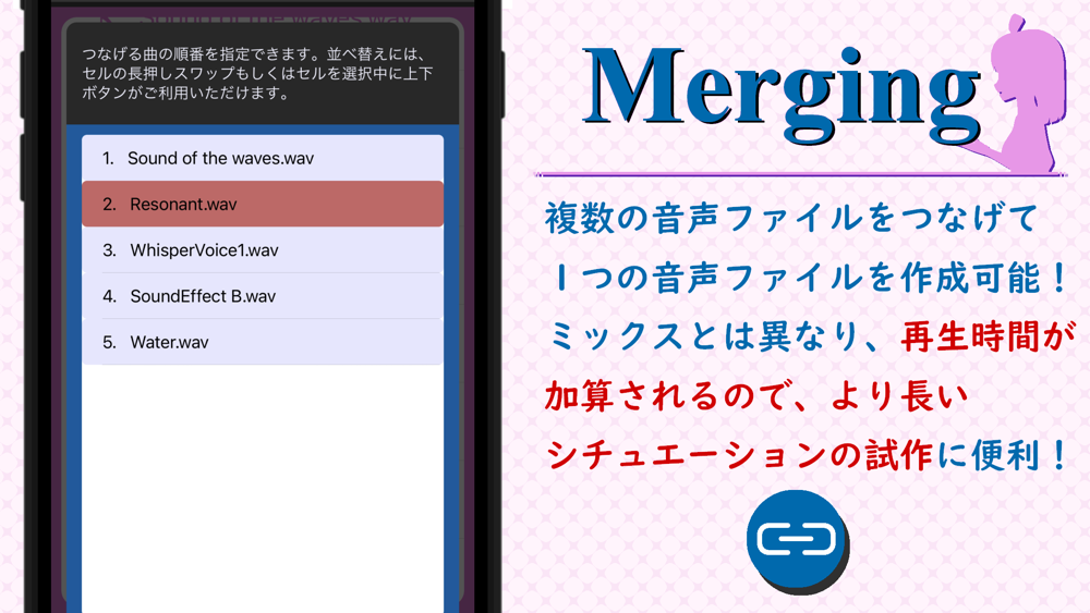 音声を複数選択し、順番を指定することで音声を連結した1つの音声ファイルを作成することができます。