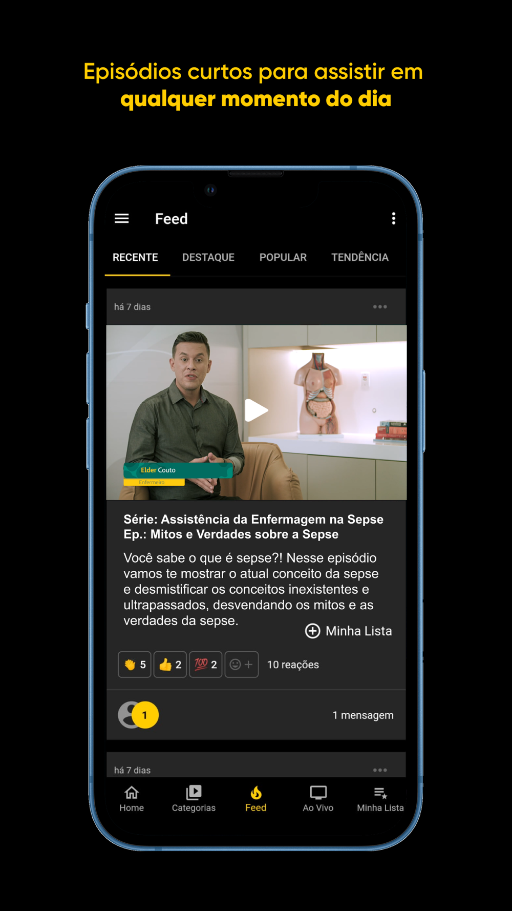Aplicativo de educação streaming exclusivo na área da saúde, voltado para técnicos de enfermagem que querem se especializar com trilhas de conteúdo exclusivas.