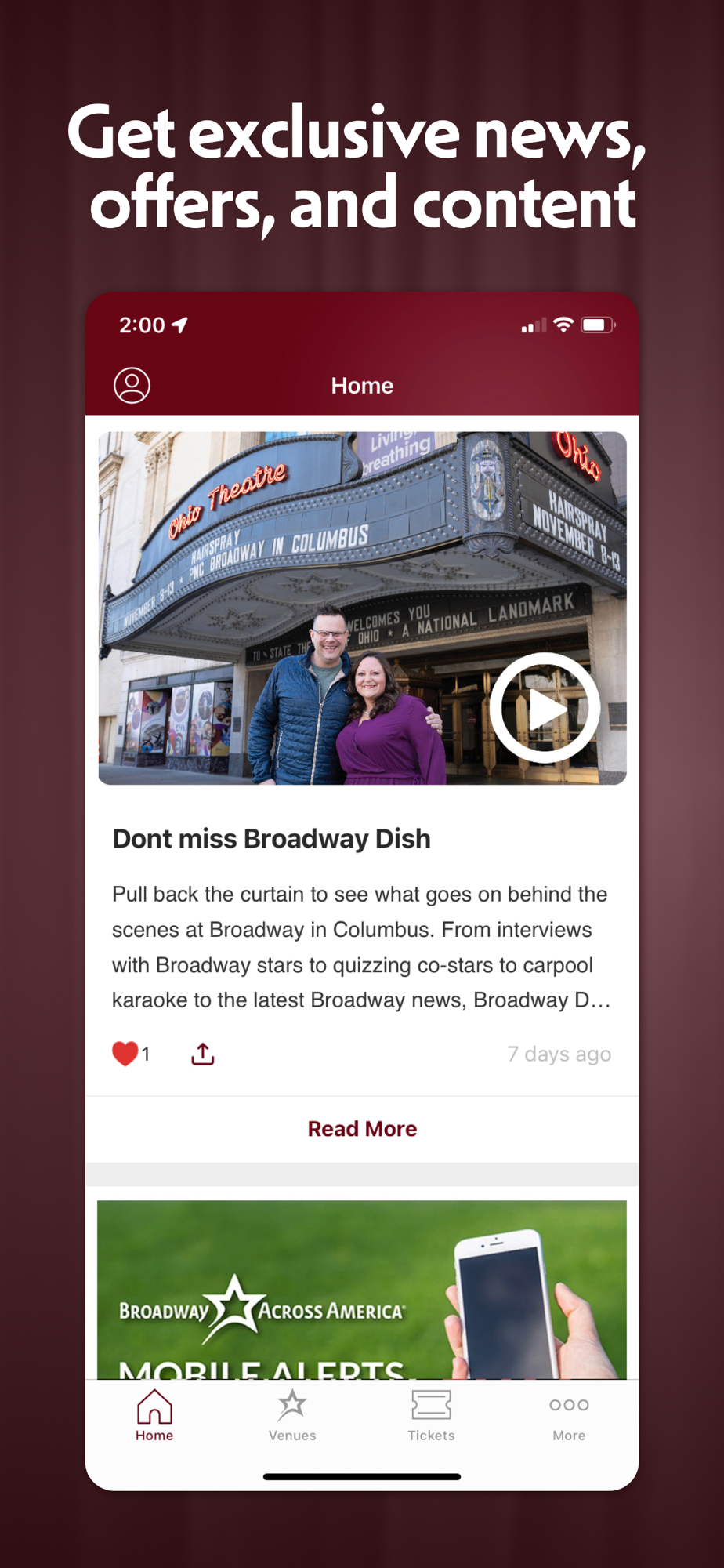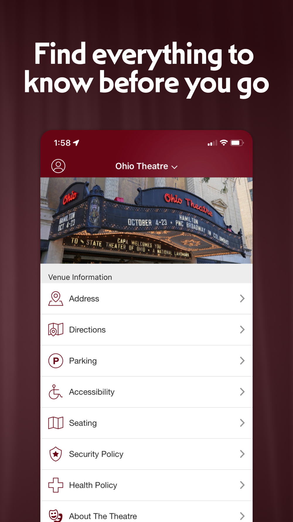 Broadway In Columbus (BIC) is proud to offer an app for ticket holders to manage all ticketing needs, access show updates, and even purchase tickets. Users can link their Ticketmaster account to BIC to allow for seamless mobile entry into each show at the Ohio or Palace Theatres. Season subscribers can access all subscriber resources, such as purchasing additional tickets, exchanging tickets if a conflict comes up or accessing their invoice at renewal time.