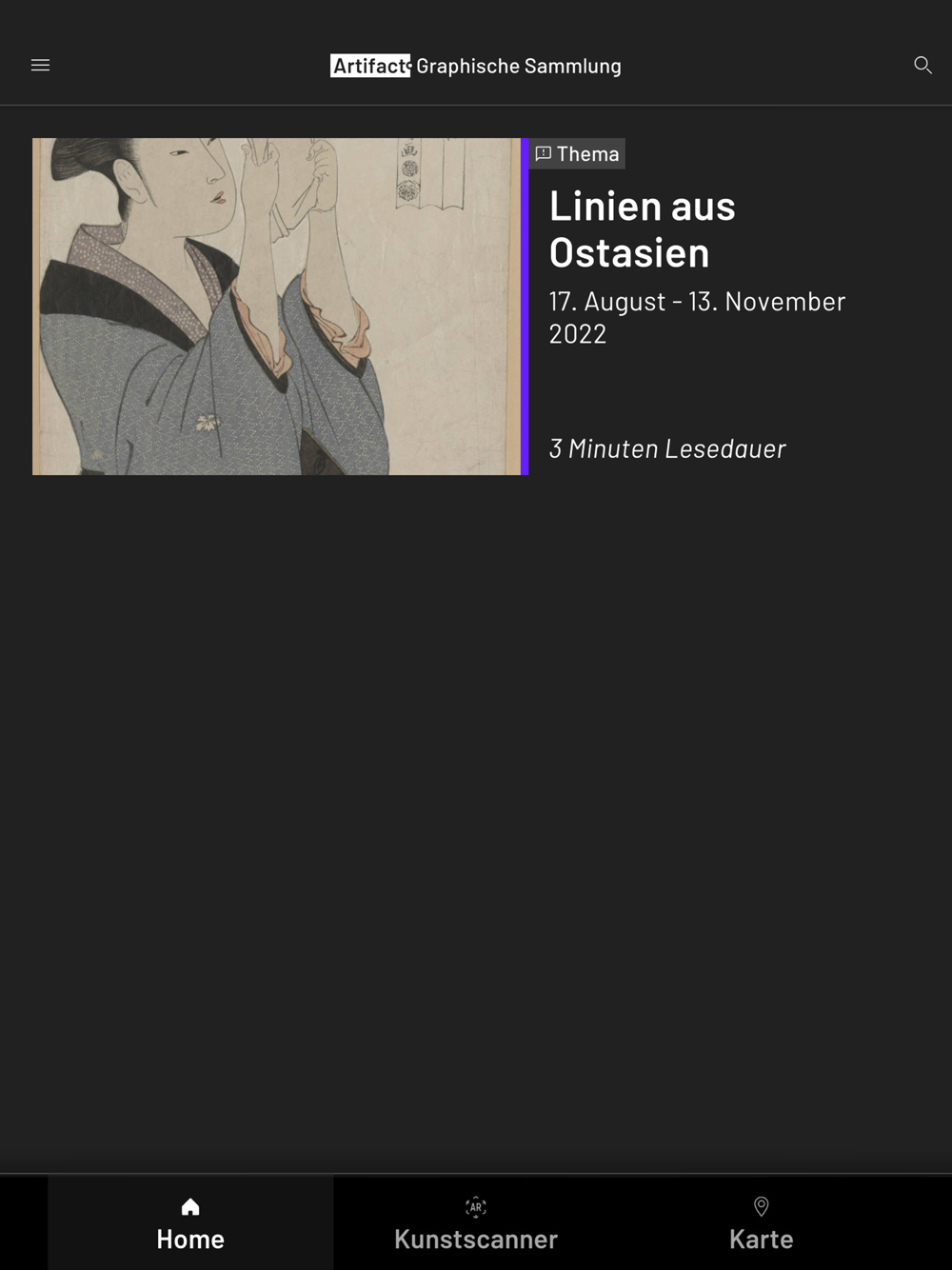 Die App begleitet die Kunstausstellung LINIEN AUS OSTASIEN. JAPANISCHE UND CHINESISCHE KUNST AUF PAPIER der Graphischen Sammlung an der ETH Zürich, Schweiz. Die App benutzt Augmented Reality, um die Kunstwerke mit multimedialen Informationen wie Bildern, Videos, Animationen und Spezialeffekten zu ergänzen, die den Besuchern auf interaktive und spielerische Weise präsentiert werden.