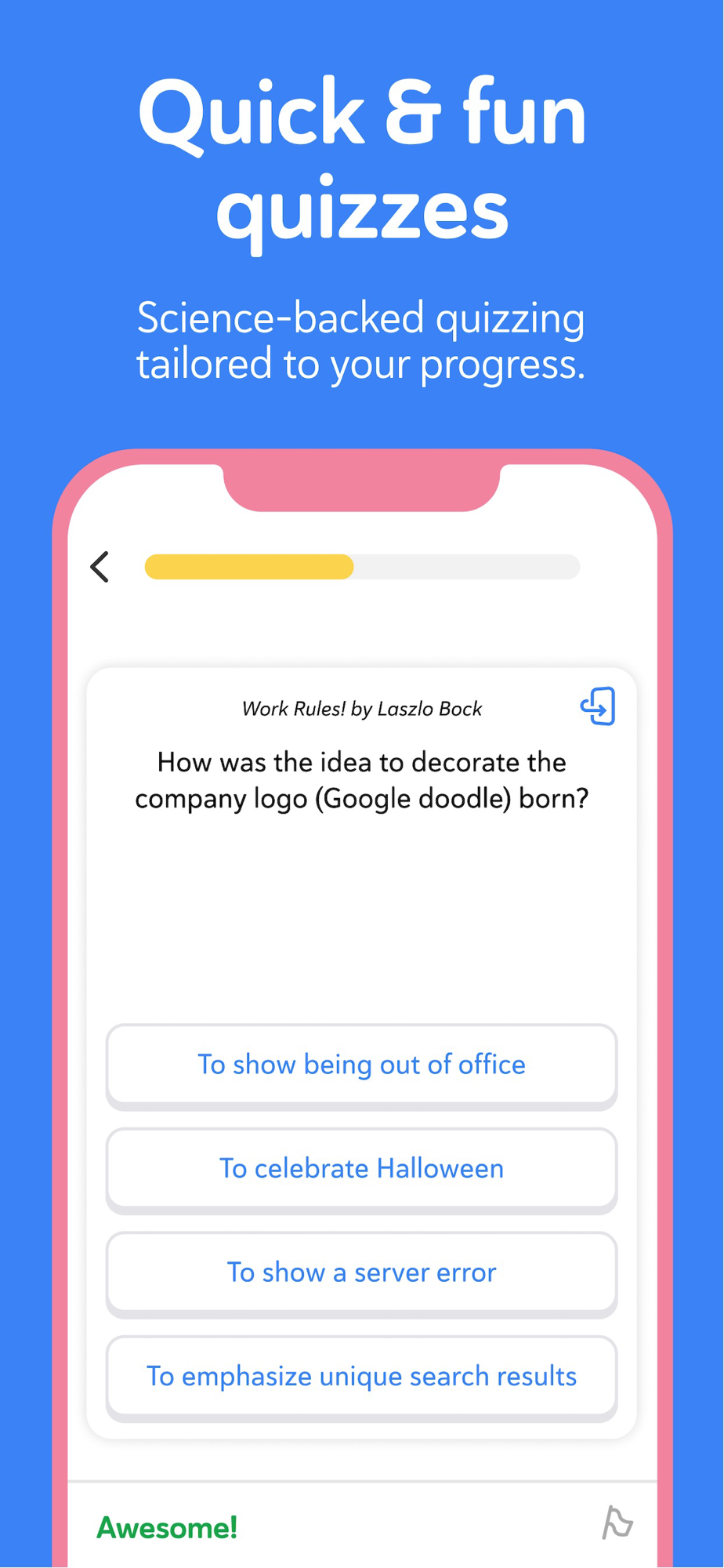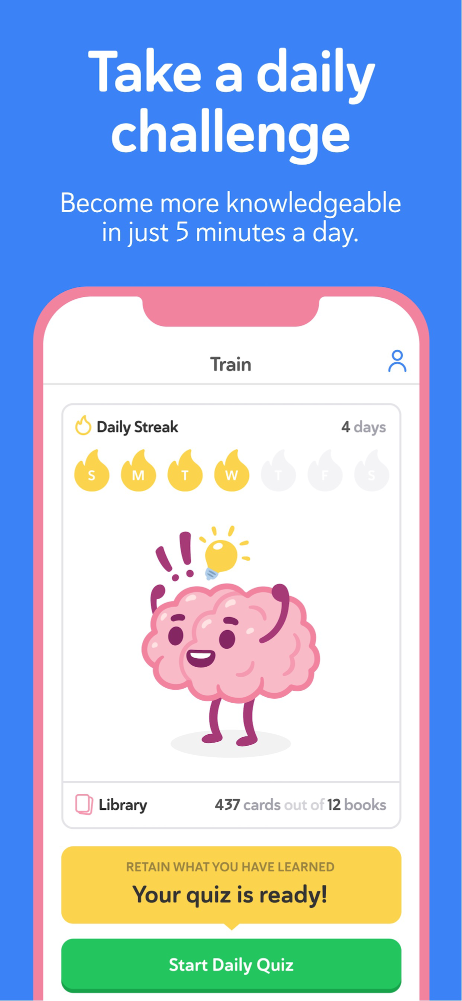 Learn from books with fun and effective quizzes. They're different every time and tailored to your retention progress.