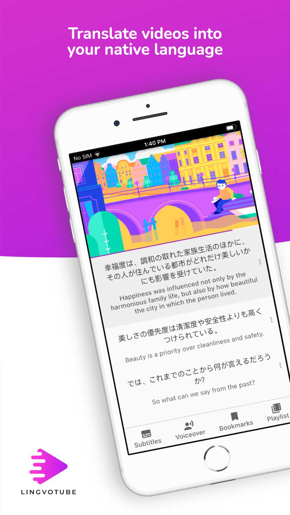Lingvotube allows you to Translate subtitles for videos and video cc (closed captions) to all languages to auto-generate real voiceovers. This subtitle translator player app helps you to convert video subtitles into your favorite languages and learn new languages by listening to voiceovers or translations. Practice your speaking, reading, and listening skills while watching videos! Improve your vocabulary and grammar skills, with the best video translator app.