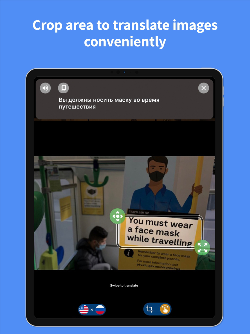 Real-time voice translation to both text and audio, tap-to-play again.