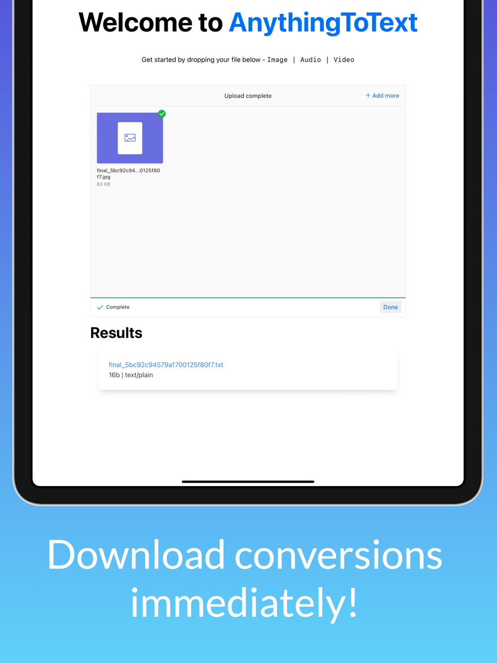 Download AnythingToText, the free image to text converter app on your iOS device and enjoy converting and transcribing audio files and video files to text files. You can also utilise the advanced OCR text scanner to convert pictures to text files.