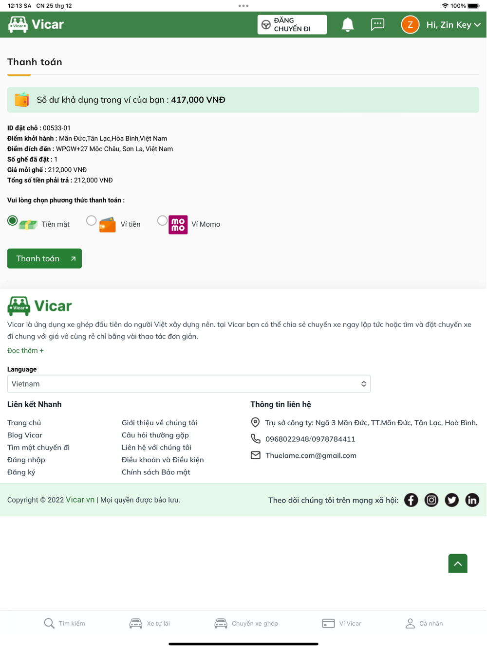 - Thanh toán linh hoạt (Tiền mặt, MoMo, Ví Vicar)