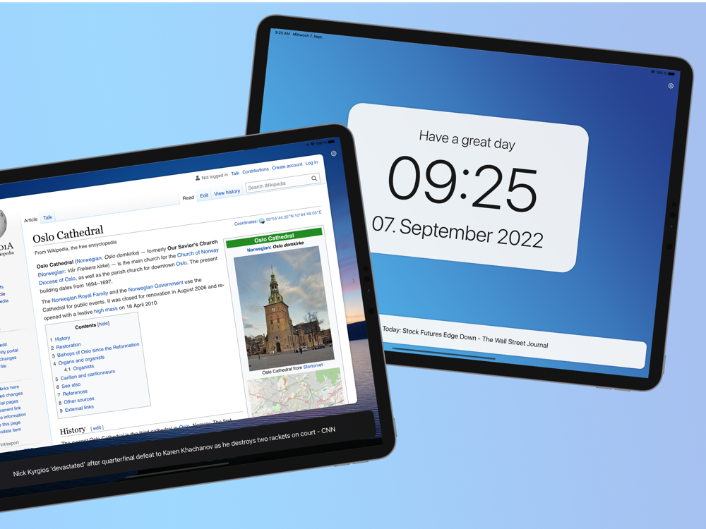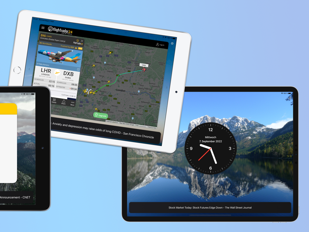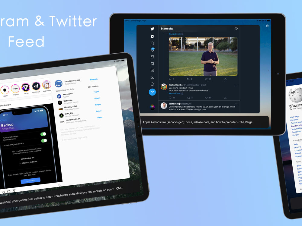 Explore various views such as Clock, Weather, News, Calendar, Notes, Flightradar24, and personalized feeds from Instagram and X (Twitter), connected to your own account. Plus, you can select your favorite websites for quick access. A running news ticker beneath each view keeps you informed about the latest developments worldwide.