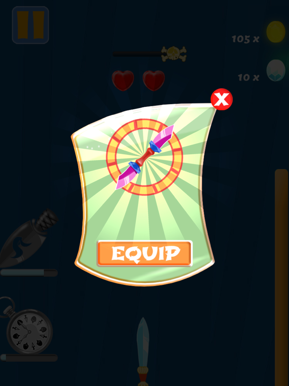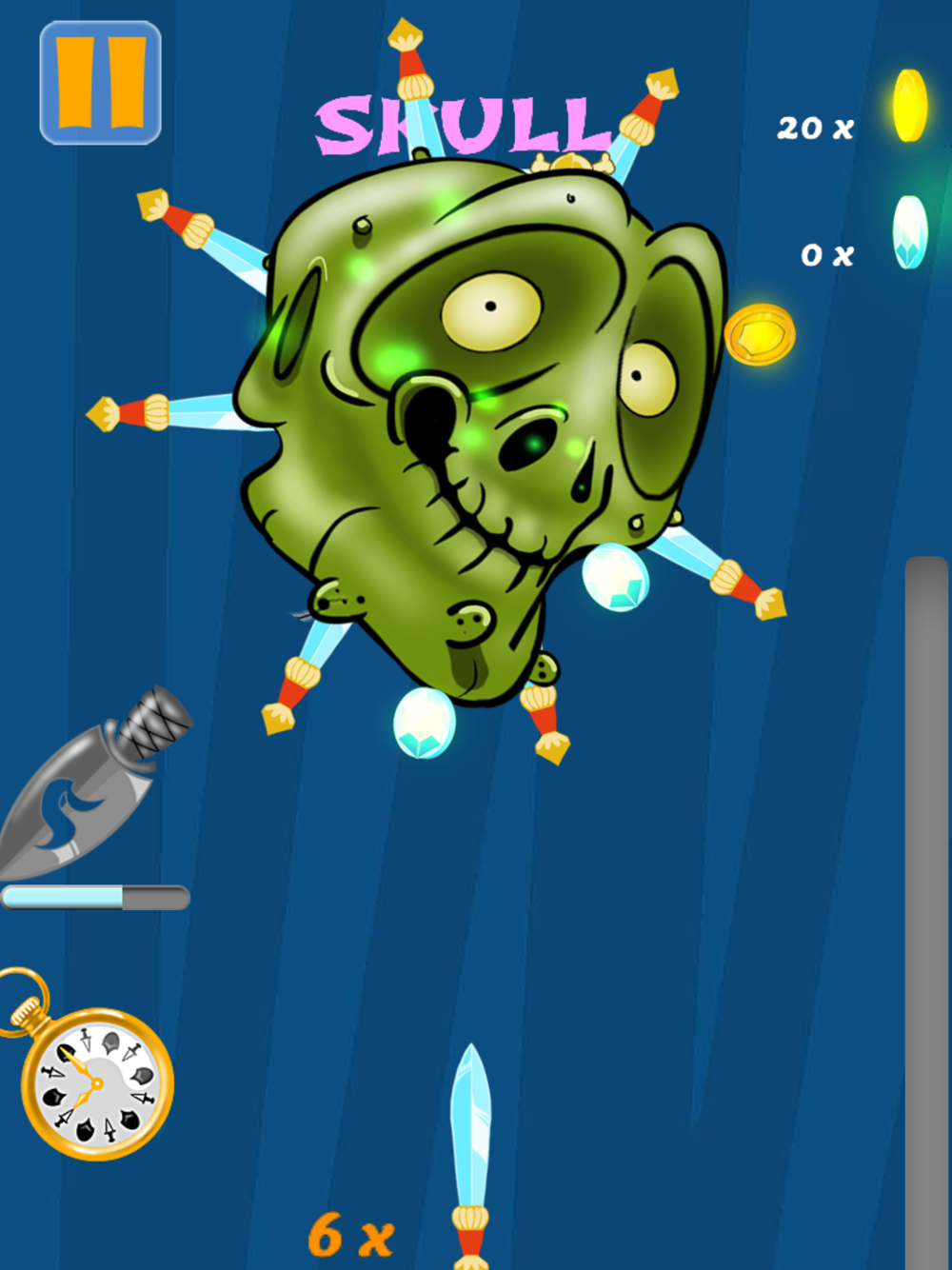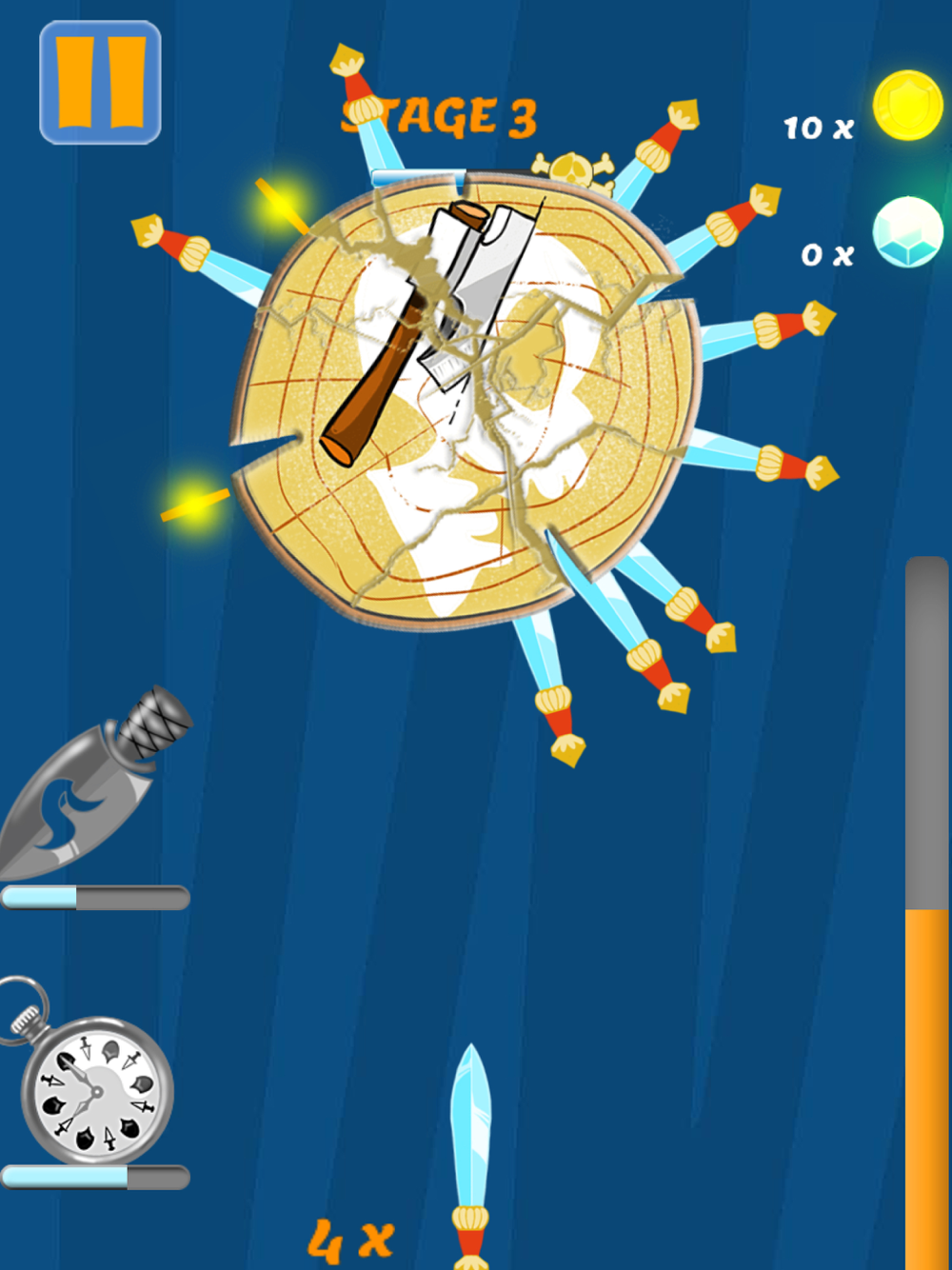 When the knife hits the target, special abilities will become available: a clock that slows down time, and a fiery sword that hits monsters the first time. Use them wisely to complete difficult levels.