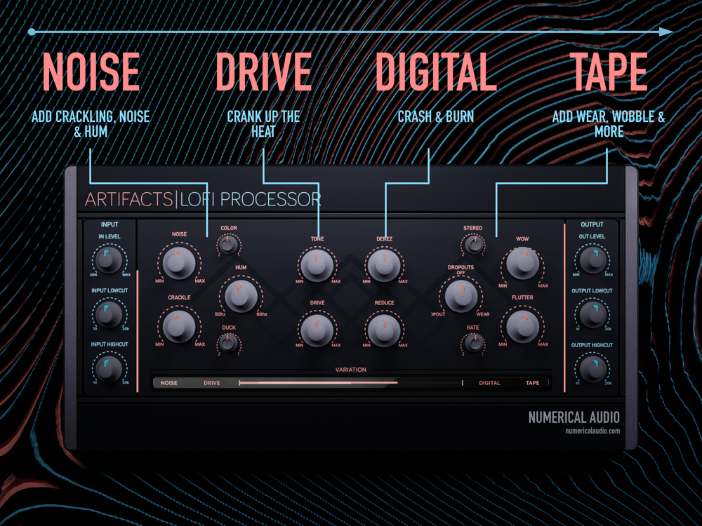 With dedicated sections for Noise, Drive, Digital and Tape, Artifacts offers a simple yet powerful way to mix and match various types of lofi effects.