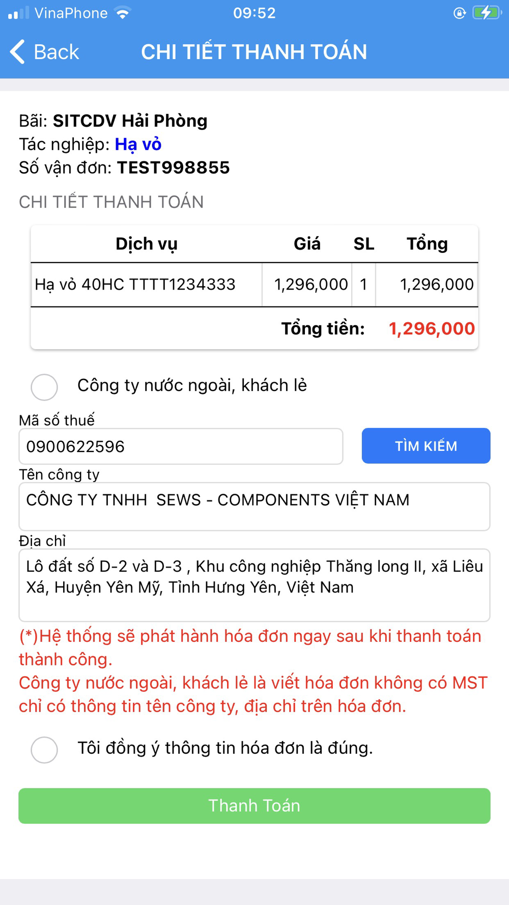- Thanh toán toàn bộ các dịch vụ bãi của SITC - Đình Vũ.