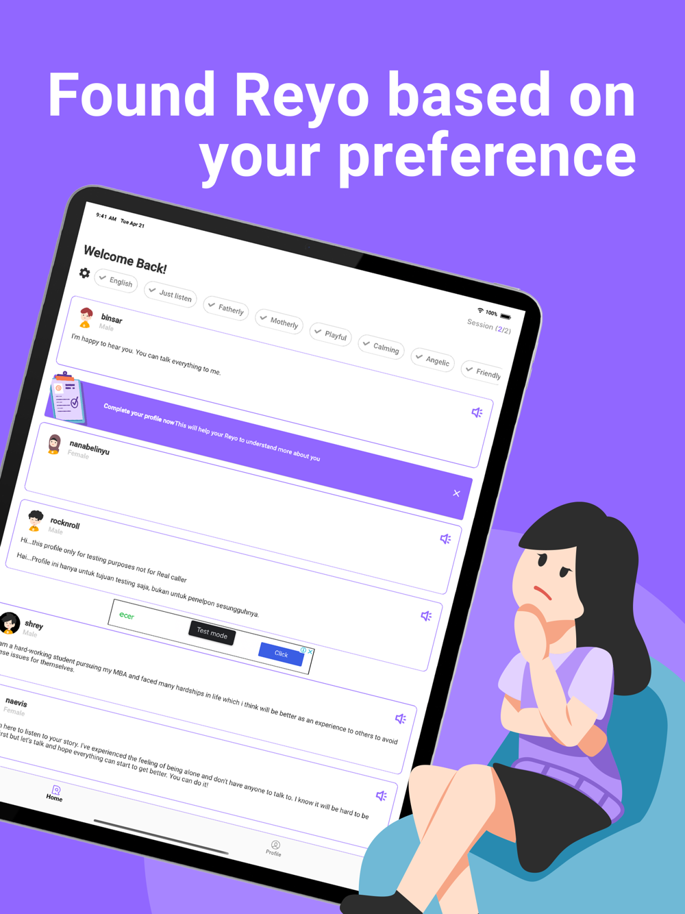 Reyo is an application created for you to express whatever you want to say privately. You can find your Reyo based on your preferences and talk about anything with them. Worry not, your privacy is also our priority so we will not record any of your conversations.